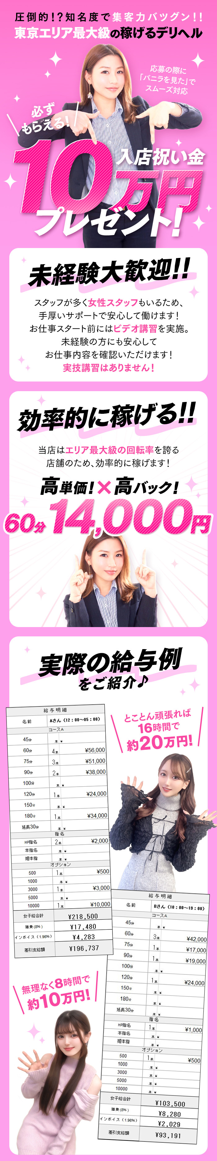 ぜひ他のお店と比べてみてください!条件を照らし合わせていただくと、当店のバック率や客層の良さが本当に衝撃的だと分かります。池袋でもトップクラスの60分15,000円バック、罰金なし、雑費も最大2,000円だけ。手元がしっかり残る仕組みです。単価が低いほど本数で稼ぐしかなく、負担が激増します。安いお店では、・拘束時間が長くなる・疲労で身体がもたない・思ったほど稼げないという現象が起こりやすいです。池袋は激戦区=集客力が圧倒的なので、単価を落とさず本数も安定しています。稼ぎやすさと安全性の両立ができるエリアです。安定した高収入を望む方には非常に働きやすい環境です。・12時間の勤務で14万円稼ぐ女の子も在籍・顔出しは完全自由・完全自由出勤で自分のペースを守れるまずは様子見で面接だけでも大歓迎です。無理な勧誘も一切ありませんのでご安心ください。働き方や心配ごとは、当日の説明ですべて解消できると思います。お気軽にお問い合わせください。「本当に稼げるのか?」という疑問は、一日体験で必ず実感していただけます。予約状況・客層・平均単価まで体験しながら確認できます。ご満足いただける自信があります。まずは一度、当店を体験してみてください。