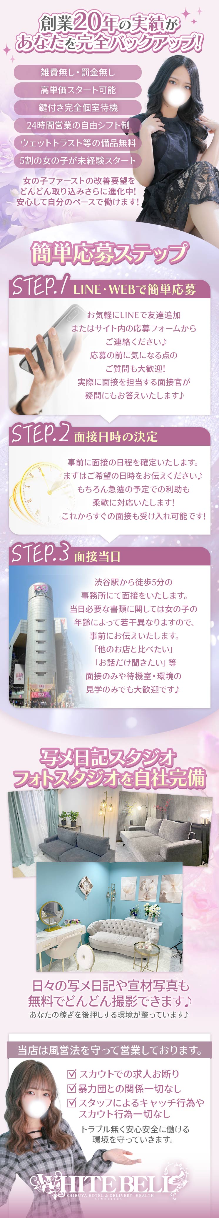 連日多忙のため、貴方の力を貸して下さい!当店では、働いてくれている女の子を第一に考え、楽しく働いていただけるアットホームなお店作りを心掛けております。現在移籍や仕事復帰を考えている貴女!お気軽にお問合せくださいね♪以前働いていたお店との関係やしがらみも一切気にすることはありません!今の働いているお店で色々な事で不満や不安を抱えている方、久しぶりに仕事復帰してみようかとお考えの方、ホワイトベルにお話だけでも聞きにきませんか?貴女の悩んでいる事に対してホワイトベルではどの様に対処していくかご説明いたしますよ♪ ・完全自由出勤ですので、月1や週1出勤でも自由に決めていただいてOKです。・24時間営業ですので、出勤時間もご自身の都合を考えて自由に決めていただければ結構です!!・出稼ぎや短期も大歓迎♪渋谷に旅行のついでに来たい!そんな女の子も大募集ですよ♪お電話でもメールでもLINEでも24時間受けてますのでお気軽に連絡下さいね♪稼ぎたい女の子を24時間募集中★18歳以上(高校生不可)の女の子ならどなたでもご応募大歓迎です!未経験でもOK!女性講師による講習が受けられますので、しっかりと技術を身に付けてからデビューできますよ♪シフトは完全自由出勤制で働きやすさも抜群◎週1日・1日3時間からでもOK!あなたのペースで自由に働けます☆さらに今なら体入するだけでとして10,000円をプレゼント!この機会にぜひご応募ください!ホワイトベル渋谷電話で応募▶▶▶ ☎03-6809-0762メールで応募▶▶▶ rct@whitebell-shibuya.comLineで応募▶▶▶ ID:@428rtvvg