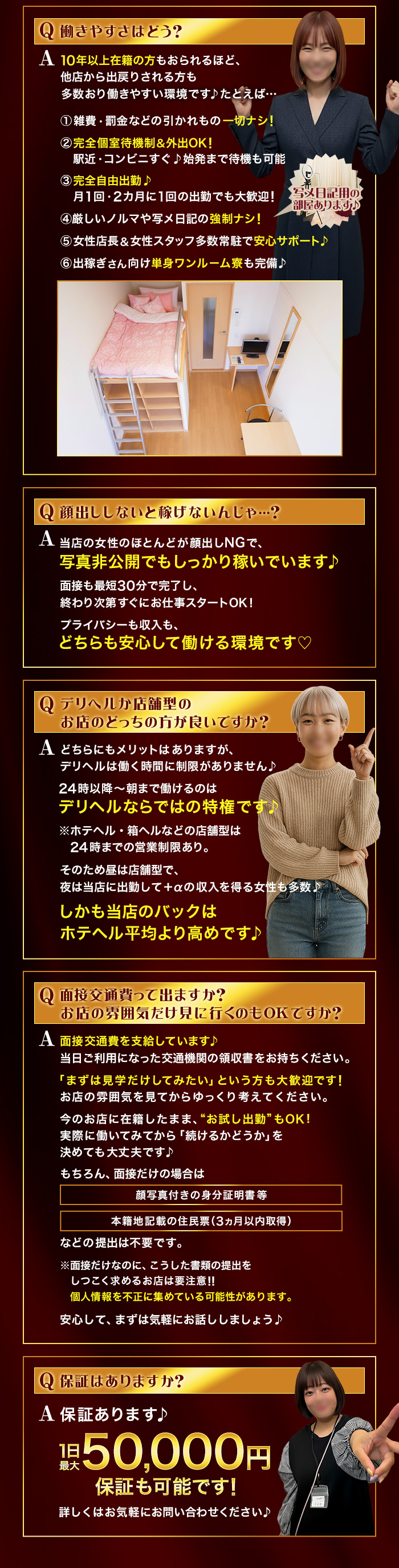 風俗で働いている、もしくはお店を選ぶ点で、女性の多くが不安に思う事が、 1、身バレ・顔バレの心配 2、本当に稼げるのか? ではないでしょうか? 当店では、より良い環境でお仕事して頂けるように、以下の取り組みを行っています 【身バレ・顔バレ対策】 ・自社スタジオによる撮影・加工 ・ご予約後のお客様の電話番号の確認 ・アリバイ対策用の法人回線 ・知人の多いエリアへの出張NG指定 【稼ぎ易い環境作り】 ・全国10万人以上の会員サービス ・時給1000円~5000円の給与保証制度 ・複数チャンネルでの同時受付も可能 ・月替わり・日替わりでのイベント開催 他にもここには書き切れない取り組みも多数あります。 是非お気軽に、何でもご相談下さい(^^)