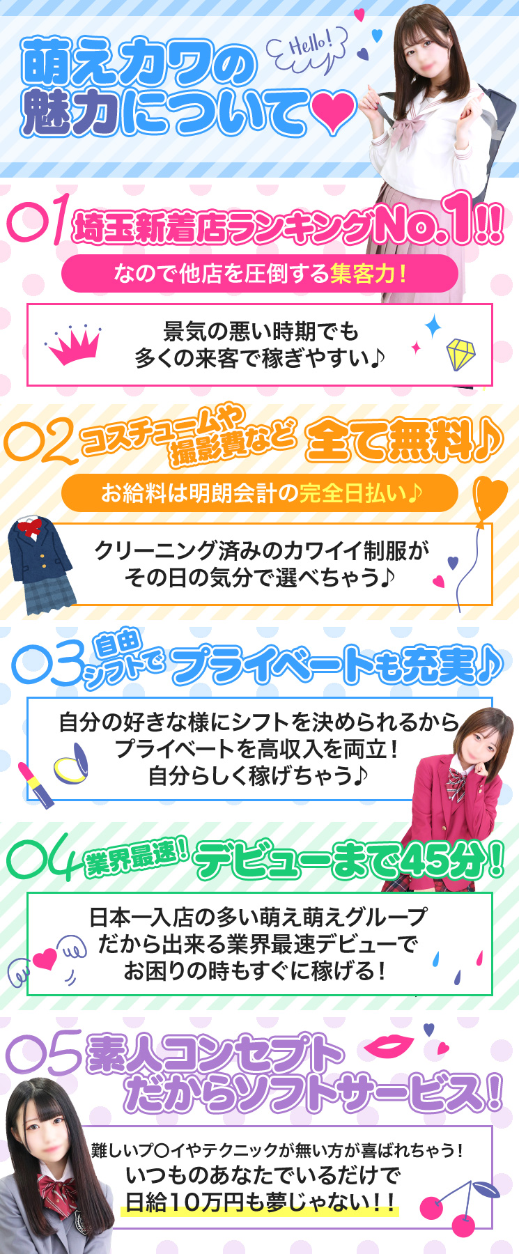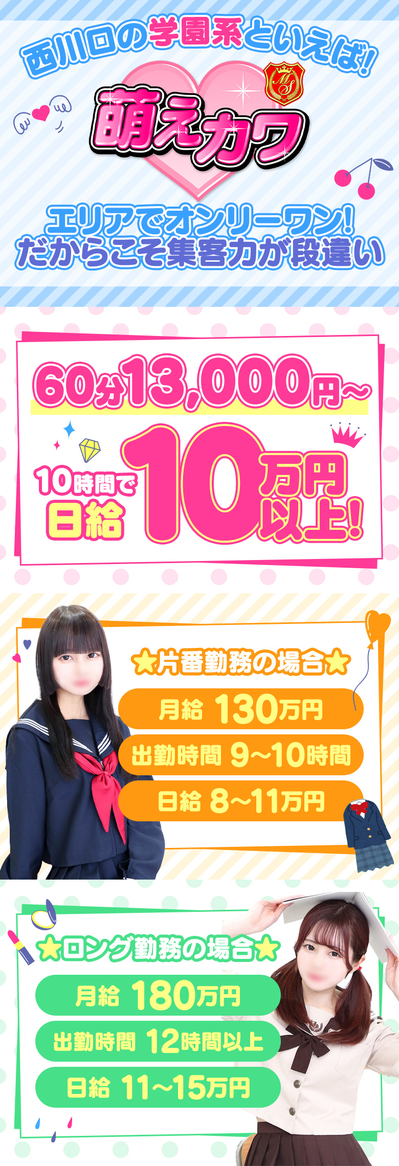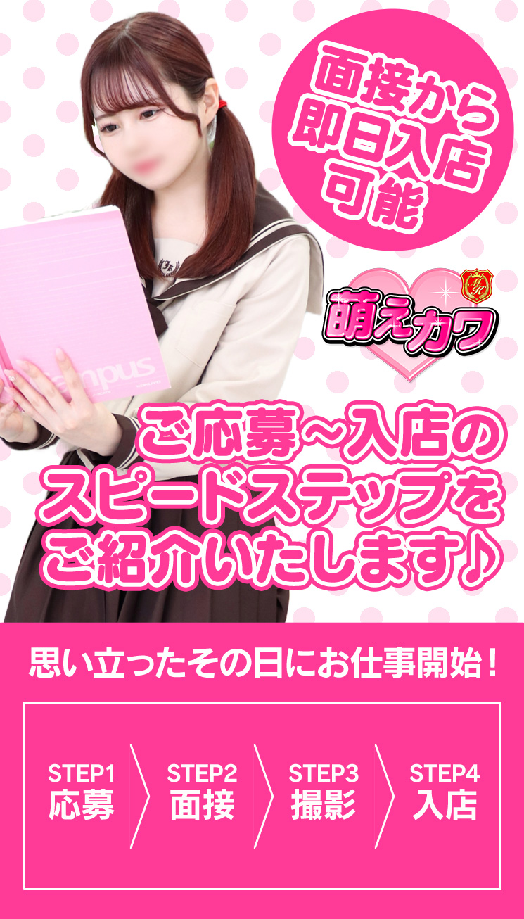 最近ほぼ毎日のように新しい女の子が入店してくれています♪萌えカワブームがきているのかもしれない(*´∀`*)そして萌えカワに来るお客様は新入生が大好き新入生情報をネットに上げると待ってましたと言わんばかりに問い合わせの電話が鳴りますお店としても新入生をプッシュしていますもちろんその後も指名してもらえるかは女の子次第ですがこのスタートダッシュの差は大きいですよね気持ちよく働きやすい環境をご用意して皆さまをお迎えできるように全スタッフが日々努力しております。皆さんがより稼いで頂くためにスタッフが皆さんと共にお仕事のサポート・ケアを行っております!また皆さんと仲良く、楽しく勤務時間を過ごせるように職場の雰囲気も重視しております!安心安全な店舗型です!☆風俗未経験で悩んでいる方☆とにかく稼ぎたい方☆自分のペースで頑張りたい方☆出稼ぎでできれば短期的に稼ぎたい方☆現場環境が整っていて動きやすいお店重視の方等々…是非上記に当てはまる方、早速面接~即日体験入店承っております♪当店の特色として、女の子に嬉しい特典を多数ご用意しております!!!・最寄駅から近い・新店により店内各部屋は綺麗・完全分煙個室待機・備品無料提供・制服コスチュームあり・マッ○プレイ無し・罰金・ノルマ無し・トラブル時によるスタッフの即対応・女子寮完備お悩みやご相談、ご不明なことは、スタッフにご相談下さい!!!親身になってお答えいたします!ご連絡お待ちしております!