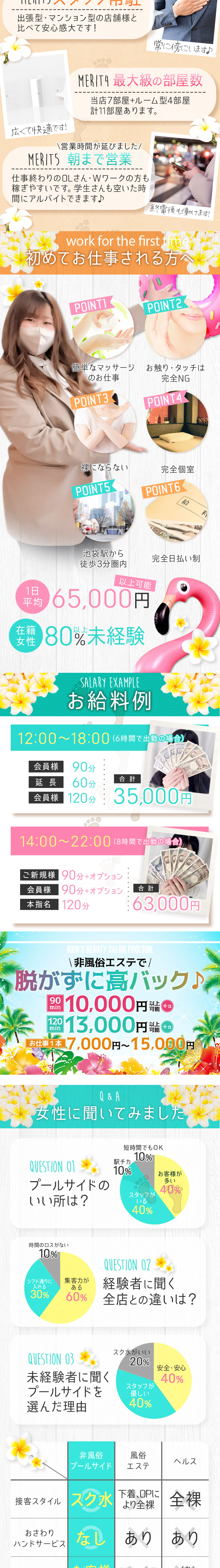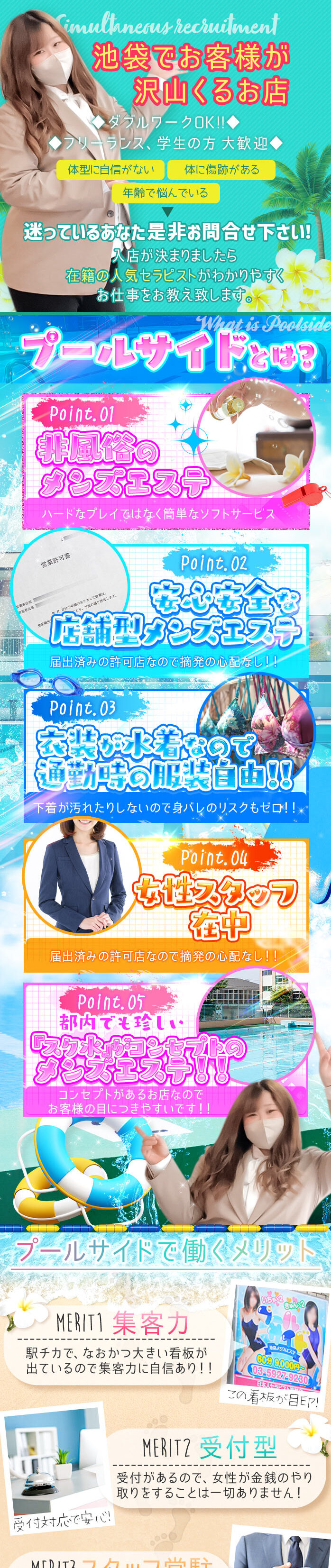 こんにちは!スタッフの「やま」です🌸いつも当店のブログをご覧いただき、ありがとうございます!今回は、女性スタッフの村上さんが届けてくれたメッセージを元に、**「お昼の時間帯のお仕事」**について少し詳しくお話しさせていただきますね✨☀️「夜」だけじゃない!お昼の需要がすごいんですメンズエステと聞くと、「夜がメインのお仕事」というイメージをお持ちの方も多いのではないでしょうか?実は、池袋プールサイドでは朝からお昼にかけての時間帯も、予約がびっしり埋まるほど大人気なんです!( ゚Д゚)✨最近では、**「在宅ワークの合間にリフレッシュしたい」**という会社員の方**「平日に休みが取れたからゆっくり癒やされたい」**というリピーター様といったお客様が多く、早い時間から安定して稼げる環境が整っています。「夜は家でゆっくりしたい」「子供が学校に行っている間だけ働きたい」という方にとって、実はとっても効率よく働けるゴールデンタイムなんですよ♪😌「未経験」や「怖がりさん」でも安心な理由新しいお仕事を始める時、「変な人が来たらどうしよう…」「怖い思いをしないかな?」と不安になるのは当然です。でも、安心してくださいね。当店はマンションへの派遣型ではなく、スタッフが常駐している「店舗型」です。もし何か困ったことがあっても、すぐ隣の部屋に私たちが控えていますし、何かあれば1秒で駆けつける体制を整えています。さらに、当店は**「健全なリラクゼーション」**を徹底しています。水着というコンセプトはありますが、性的サービスは一切禁止! 厳格なルールをお客様にも守っていただいているので、セラピストの皆さんは安心してマッサージを通じた癒やしを提供することに専念できます。🌸 ライフスタイルに合わせた「自由シフト」池袋プールサイドは、完全な**「自由シフト制」**です!「朝の数時間だけサクッと」「お昼休み返上でガッツリ」など、あなたの都合に合わせてスケジュールを組むことができます。アットホームな雰囲気なので、シフトの相談はもちろん、「今日はちょっと緊張するな…」なんていう些細な悩みも、私たちスタッフに気軽に話してくださいね。「まずは見学だけしてみたい」「話だけ聞いてみたい」という方も大歓迎です!いきなり面接はちょっと…という方は、まずはお店のお茶を飲みに来るくらいの気持ちでお問い合わせください✨あなたの新しい一歩を、スタッフ一同全力でサポートします!素敵な出会いがあることを楽しみにしています💌ご応募お待ちしております!