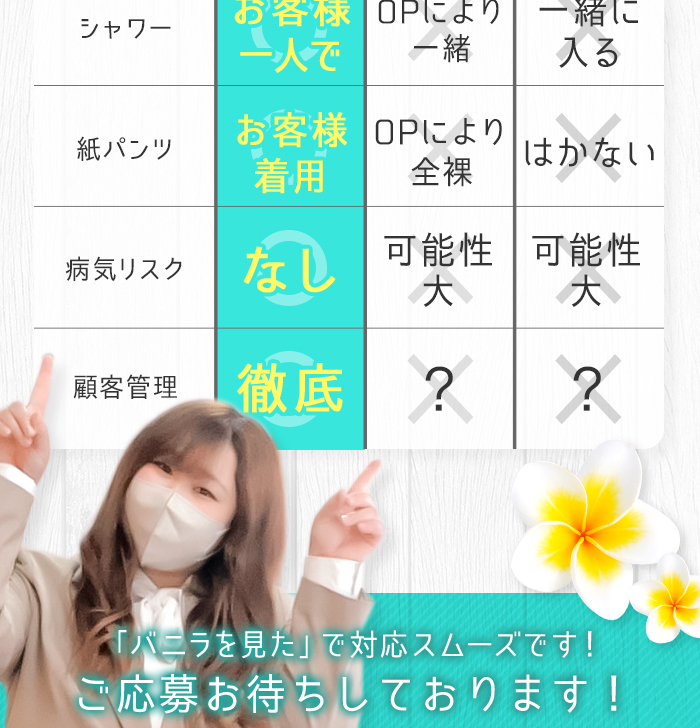 優しいスタッフさんの存在が魅力!しっかり稼げるお店!『バニラ』を見て、集客力が高そうだと感じて応募した“しおり”さん。面接時、優しいスタッフさんの女性ファーストな考え方が好印象で、入店を決めたとのことです。また、しっかり稼げる点も魅力なのだとか。「がんばった分はちゃんとお給料に反映されるので、モチベーションが上がりますね」と話してくれました。