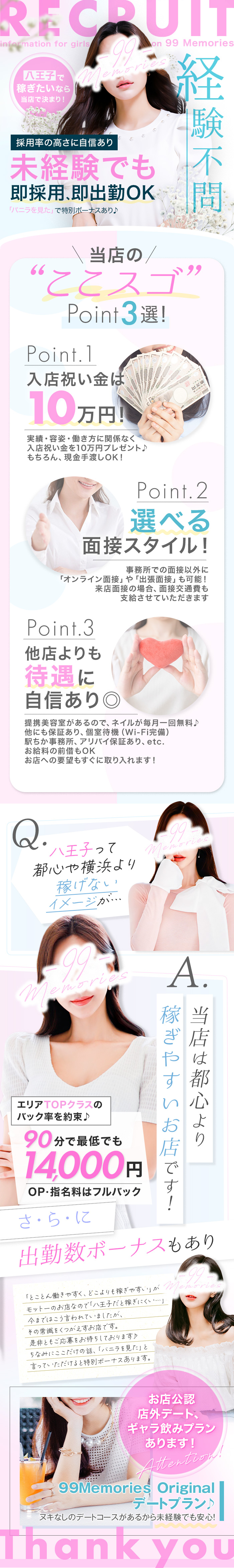 ◆入店祝い金は10万円!!◆ 90分で最低14,000円バックは八王子TOPクラス💪オンライン面接可出張面接可採用後の即勤務可未経験者大歓迎🔰高待遇をお約束🙌お気軽にお問い合わせください☺️
