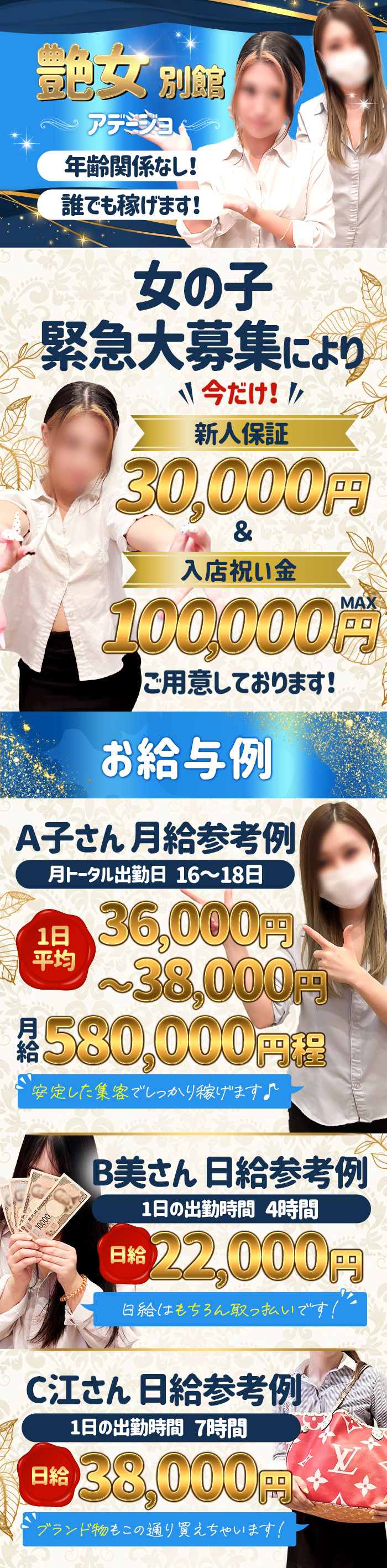 自分の「歩く道」は・・・自分が決めるんだ・・・みなさんこんちは(*'ω'*)NetflixでJOJOを見続けて、最近自分がブチャラティなんじゃないかな?と思い始めてる勘違い人間こと「ウエダ」でっす!今回は、みなさんが一番気になっている部分ッ!そして、見せちゃっていいのかな?っていう一番触れちゃいけない部分ッ!「1日がんばって結局いくら稼げるの?」そう!お金の話でっす!!本日は「まさき」さんの1日のお給料を見せちゃいまっす!(内緒ですよ?)勤務時間は16:00~22:00の6時間勤務です!もちろん勤務時間は、希望シフトを出してもらい、そのお時間内での勤務になります(*'▽')「お仕事」は「お仕事」、「プライベート」は「プライベート」がんばって稼いだお金は、自分のために使いたいですもんね♪日払い額は交通費含めて32,000円になります♪内訳として「時給」+「バック」と交通費は気持ち程度ですが、別にお手当として出させて頂いております!時給も月1ペースで上がっちゃうので、やればやるほど稼げちゃう!!ただ、そこで終わらないのが艶女別館です!!女の子を稼がせるためならトコトン稼がせるのが艶女別館!!よくある「本指名いっぱいきたらボーナスあげるね」なんてもう古いッ!もちろんもちろん、指名がたくさんきたら別でボーナスをお出しするのですが当店では「フリー」にたくさんついてもボーナスをお出ししております(>_