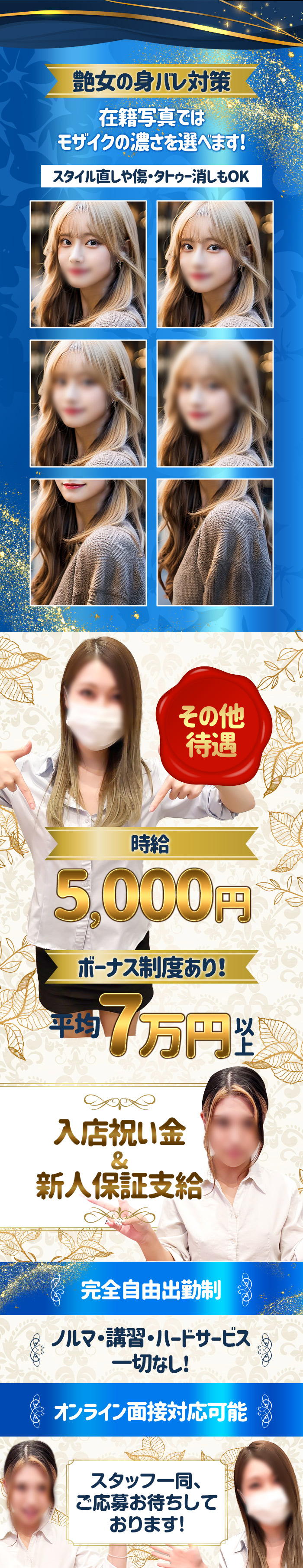 ①面接30分→講習(実技講習はありません)→その日に体験入店可能。 ②その日にお給料を全額手渡し。 ③店内では常に男性スタッフがサポートさせて頂きます。 ④写真は全体を写しますが、個人の特定ができないように顔は首から下を映します。 ⑤時給保証があるので接客していない時間もお給料が発生します。 |