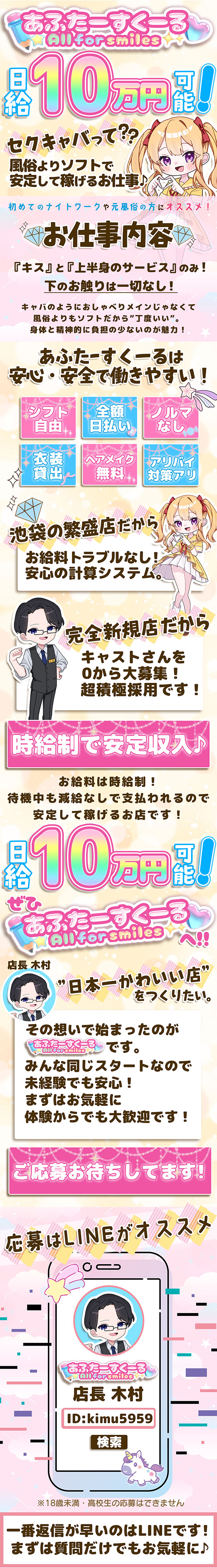 皆さま、こんにちは。「あふたーすくーる」店長の木村です🌸当店の求人ブログをご覧いただき、ありがとうございます。🚀面接と体験入店は同日対応!「体験入店って後日になるのかな?」「面接に行ったら、そのまま働いてみたい!」そんなご希望にお応えして、面接と体験入店は即日可能です✨必要なのは身分証だけ。衣装や小物はすべてお店でご用意しているので、準備ゼロで大丈夫です!🚀安心して体験できる理由 制服や小物はフルレンタル完備 スタッフが横について丁寧にサポート 接客はソフトサービス中心で体への負担も少なめ その日の頑張りは全額日払い💴 「自分に合うかどうか試してみたい」そんな気持ちで来ていただいて大丈夫です😊🚀新規オープンだから働きやすいあふたーすくーるは2025年8月にオープンしたばかりの完全新規店。先輩・後輩の上下関係も派閥もなく、全員が同じスタートラインです。安心してお店の雰囲気を体感してください!🚀まずは気軽にご相談を♪「即日体験できるかな?」「必要な持ち物は?」どんな質問でも大歓迎です!まずは気軽にご連絡ください✨