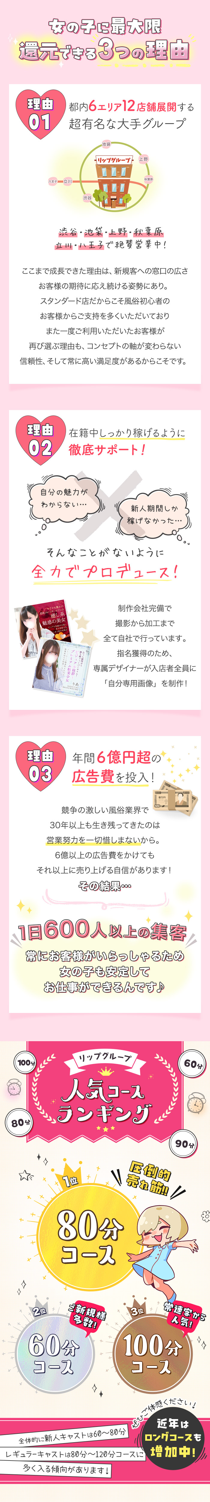 大手グループが経営しているお店だよ。待遇や条件も手厚くて安心だし、集客力もあって女の子が稼ぎやすい!待遇や条件はグループの中でも店舗ごとに変わってくるから、気になるポイントは問い合わせて聞いてみよう♪