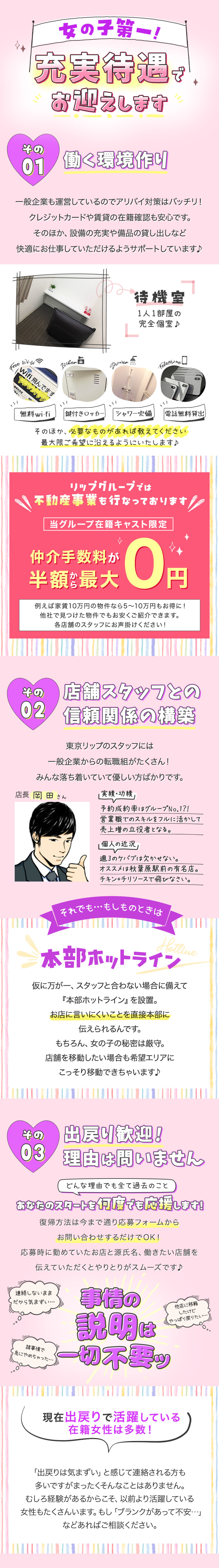 スタッフさんは適度な距離感で優しく接してくれます。お仕事に関する悩み事にも親身になってアドバイスをくださったり、万が一お客様とのトラブルがあってもしっかりと対応して下さるので、安心して働くことができます。 また、個室待機で他の女の子と顔を合わせる機会が少ないので、人間関係を気にせず待機でゆっくり過ご...