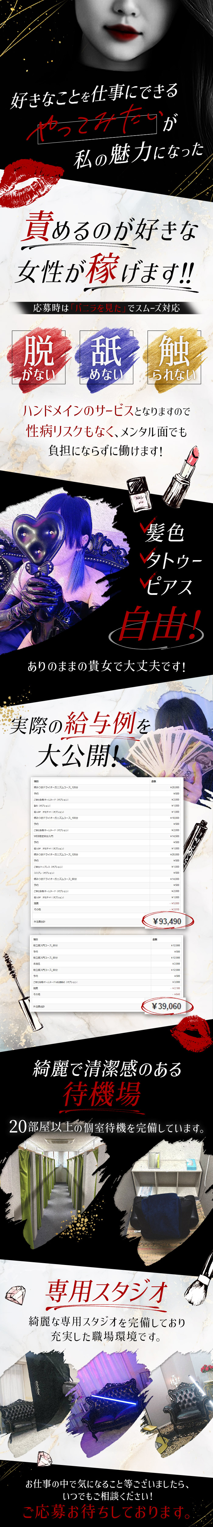女性主導のサービスだから安心安全!ありのままの自分で働ける!同店が提供するサービスはすべて女性主導のため安心安全。お客様もルールをしっかりと守られる従順な方が多いそうです。また個性を活かして働ける環境も魅力。取材した“雑司ヶ谷五郎”さんは「派手髪、ピアス、タトゥー、すべてオーケーです。ボンテージやコスプレでお仕事をしたい方、ぜひ!」と話していました。