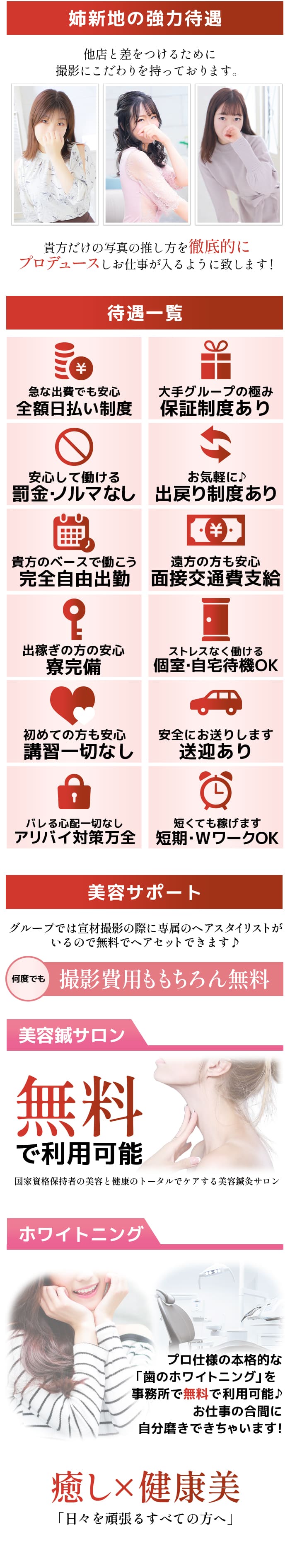 ☆↓当店のココが自慢!↓☆ ・完全自由出勤 ・ノルマ、罰金無し ・毎月1回の性病検査を実施 ・マツエク、ネイル、美容室代は当店負担 ・在籍確認や給与明細の提出可能!アリバイ対策は万全です! ・女性が安心してお仕事できる、当店独自の徹底した顧客管理システム ・完全業界未経験でも徹底したバックアップあり! 他店には無い健全なサポートです。 |
