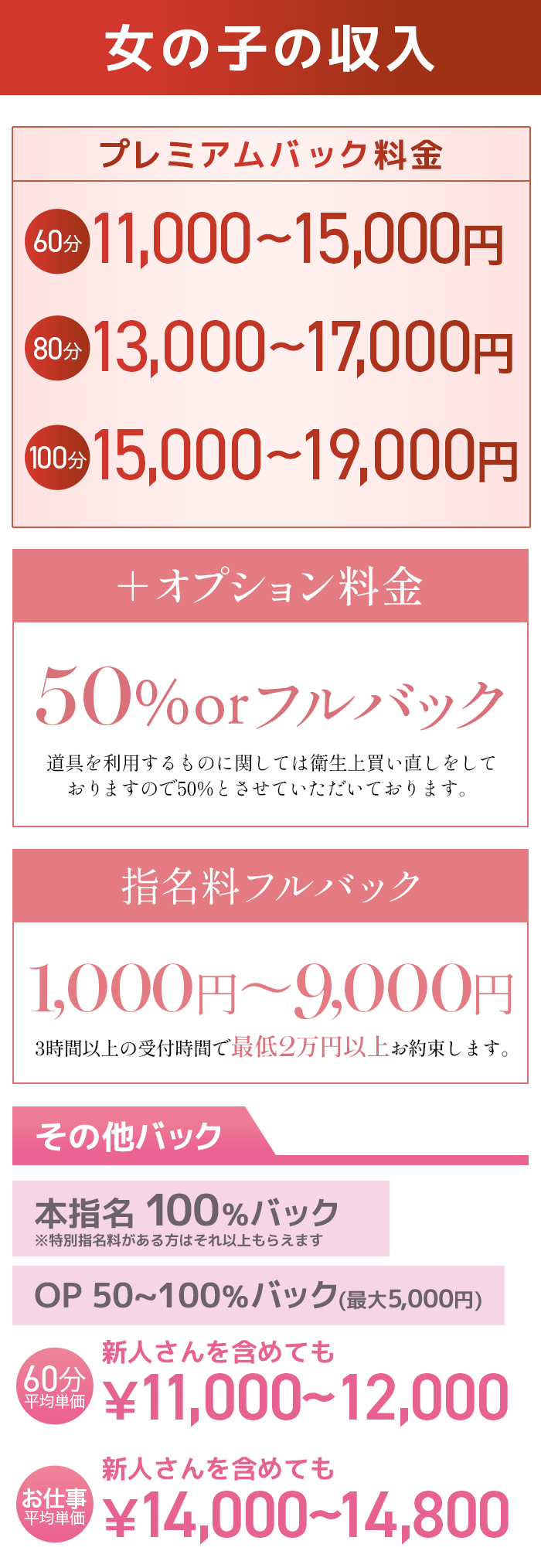 お仕事した時の自分へのバック率が70%以上のお店だよ♪[売上の総額から◯%バック]や[オプションは◯%バック]などの詳細はお店によってちがうみたいだから、バック率のシステムによっては大きく収入が変わる場合もあるから、しっかり確認をしてみよう!