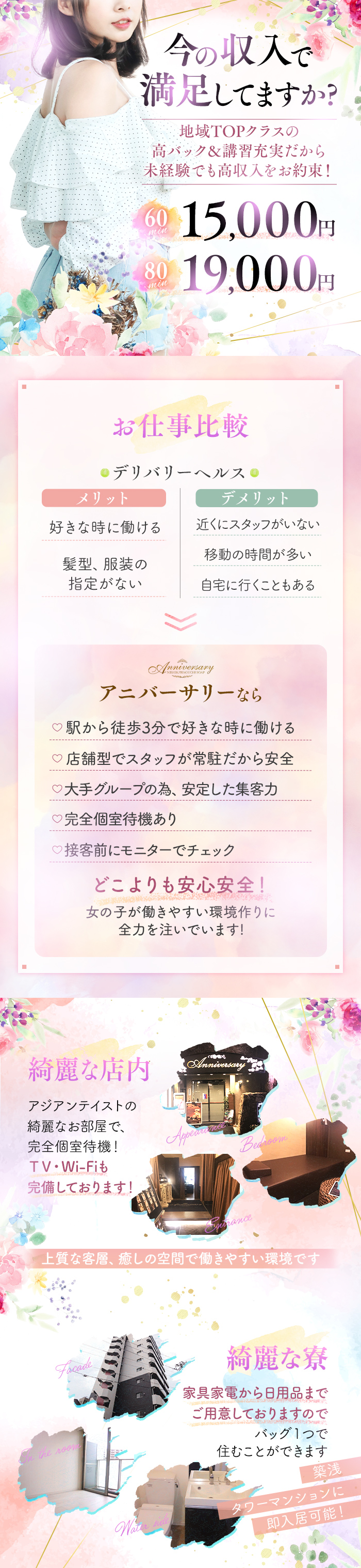 「通うには遠いな~」とか「引っ越ししたいな~」そんなときでも、お店が契約しているマンションを宿泊施設として用意をしてくれるよ☆だから面倒な手続きもないし、家賃が無料や格安で、支払いも給料引きだったり融通が聞くから、必要な人は詳しく聞いてみてね♪