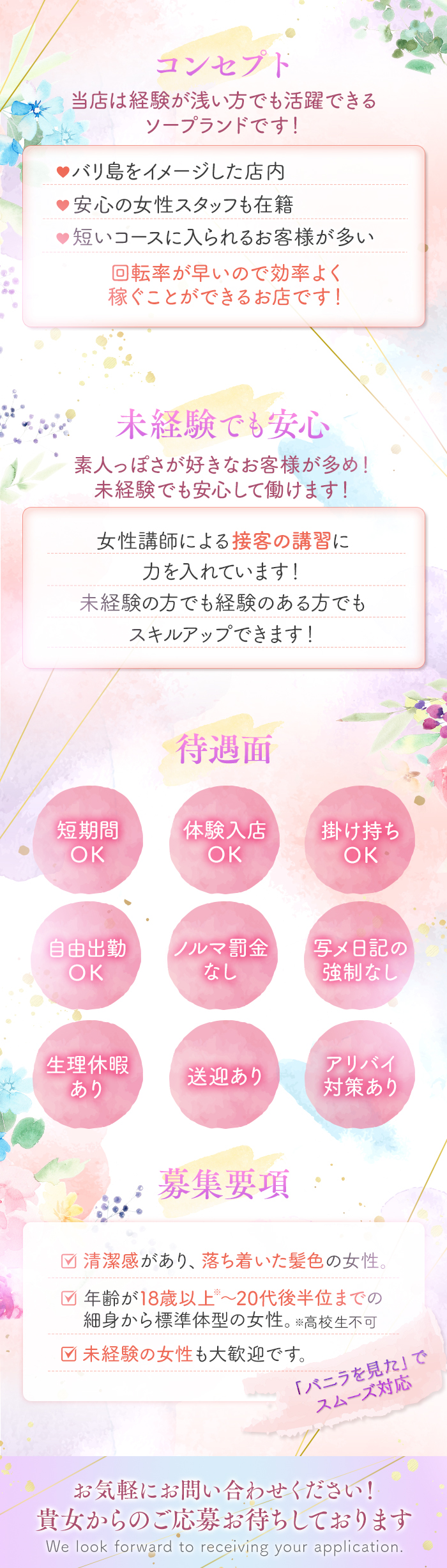 まずは応募フォーム、SNS、電話等からお気軽にお問合せください!質問のみの問い合わせも大歓迎です。