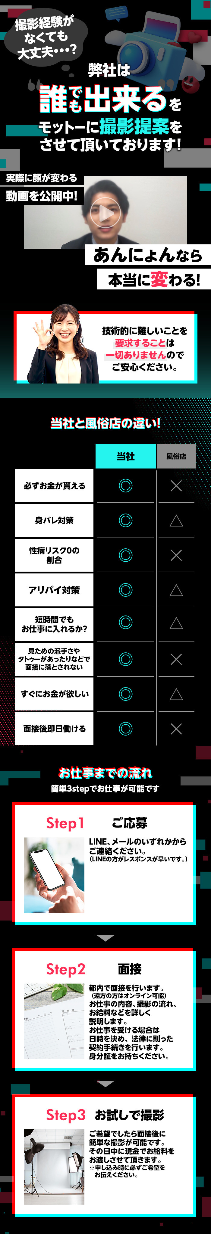 「私なんて、可愛くないから...」自信ゼロでも、あんにょんなら主役です🌸「夜職に興味はあるけど、自信がない」「モデルなんて、美人がやるものでしょ?」そんな風に諦めるのは、まだ早いです!✨🤖 AI顔変換が、あなたの不安を「ゼロ」に。あんにょん最大の魔法。それは【最新のAI顔変換】!✨撮影した素材は、AIで目・鼻・口のパーツをすべて別人に入れ替えます。✅ 今の自分の顔は、世に出ません!✅ AIで「理想のモデル顔」に生まれ変わる!✅ だから、誰にも絶対にバレません!「素材」としてのあなたがいれば、顔の造形は関係ありません😊🤝👠 「ありのまま」の自分でOK!あんにょんが求めているのは、顔の美しさではなく、マニアックな魅力です。マニアックな人々に刺さる部分が主役!あなたの「ありのまま」が、誰かの「宝物」になります。コンプレックスだと思っていたところが、実は最高の武器になる世界なんです💖自信は、あとからついてくるもの。最初はみんな不安です。でも、撮影が終わってお給料を手にした時、「私にもできた!」という自信に変わるはず。✨あんにょんは、あなたの新しい一歩を最新技術と優しさで、全力サポートしますっぴ!📣💕📩 応募・ご相談はこちら💬 LINEで不安なこと、全部教えてください✨LINE ID 👉 annyong_parts※ご応募は 18歳以上(高校生不可) に限ります🙏