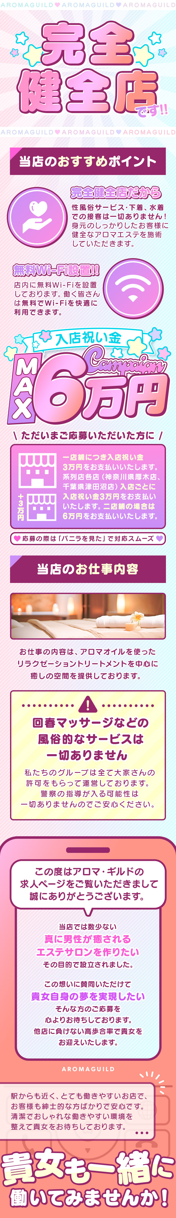 私たちのグループでは津田沼店、厚木店を運営しており各店舗セラピスト大募集中です!当グループでは全て大家さんの許可を受けてメンズエステを運営しております。こちらの広告を見て貴女に合った店舗でお仕事を考えていただければと思います。千葉県 津田沼店→JR津田沼駅徒歩2分神奈川 厚木店→JR本厚木駅徒歩5分求人TEL0120-069-777求人LINEhttps://line.me/ti/p/SFGkt2UG68厚木店mailatsugi.aroma.guild@gmail.com津田沼店mailtsudanuma.aroma.guild@gmail.comご連絡お待ちしております。