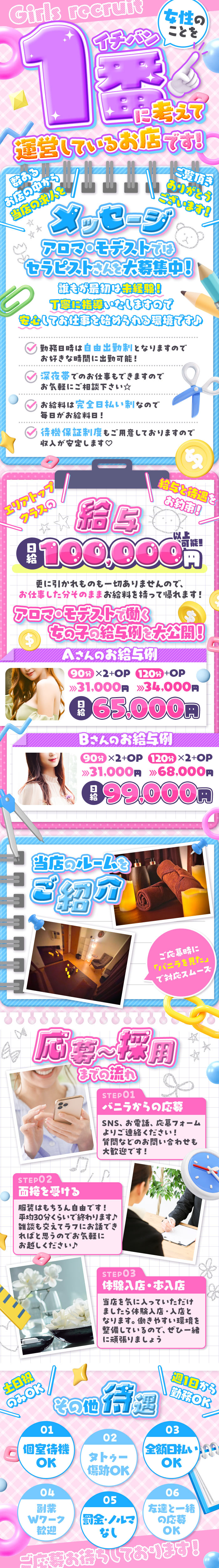 待機保証制度あり/完全日払い制/各種ボーナス制度あり/ノルマ、罰金、雑費一切なし/Wi-Fi完備/電子レンジ&冷蔵庫完備/テレビ完備/制服貸与/個室待機 |