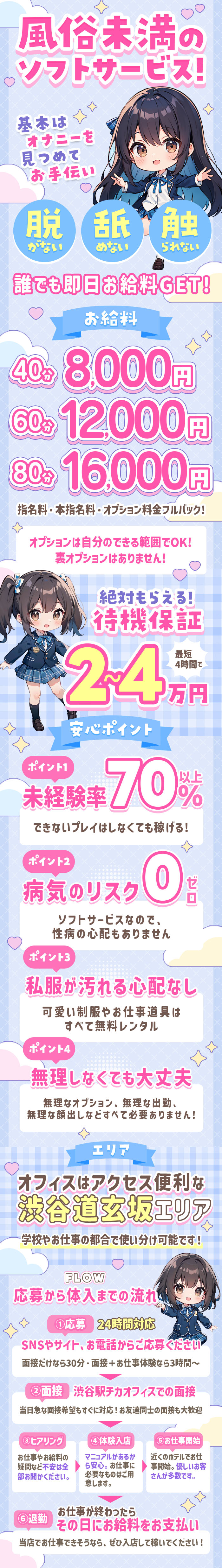 モデル系、ちょっと大人めのお店はスタイルが良くないと難しい部分がありますが、当店のようにカワイイ系、ロリ系のお店は体系よりも可愛さ!愛嬌!のほうが重要になります!(キレイすぎるより、フツウの子の方がウケが良いです)制服も割と体型が出ないのも安心ポイントです!