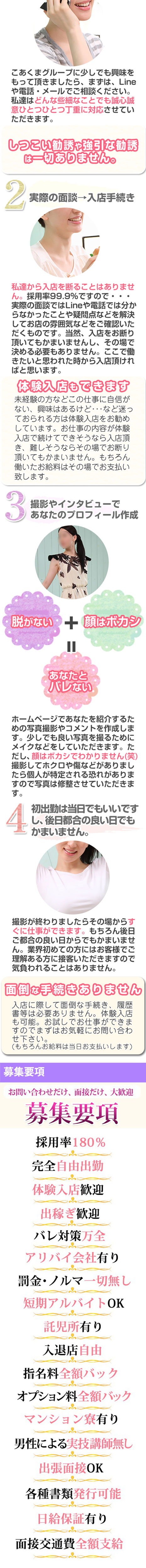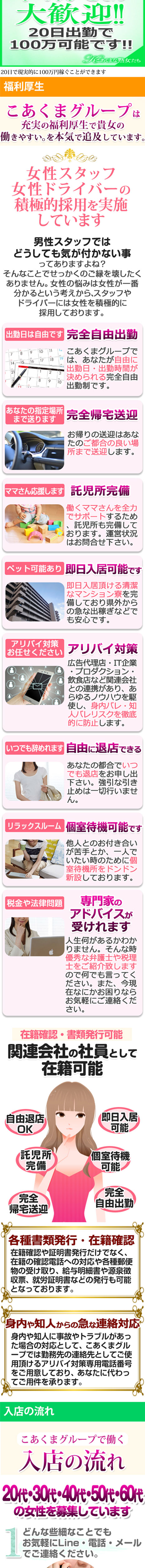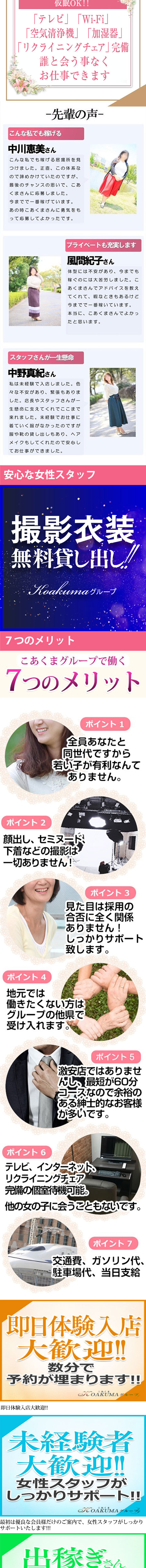 こあくまグループだからこそ可能な仕事量!回転率が違います。高額バックであなたを応援します。 オプション料や指名料は全てあなたに差し上げています。 行きたくない地域やホテルは外せます。 お給料は、無条件でその日のうちに全額お支払いします。体験入店の方も同じです。