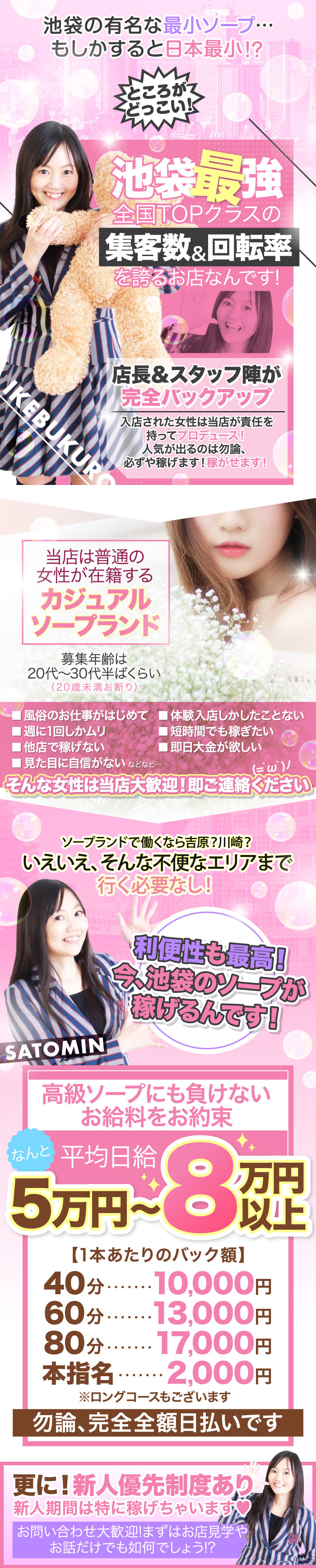 吉原、川崎まで行く必要ありません!池袋というエリアでしっかり稼ぐことが出来るのが当店の強みです!▼風俗のお仕事が初めてで不安…▼短期でガッツリ稼ぎたい!▼安定した収入が欲しい!▼他店では中々稼げなかった…▼今すぐお金が欲しい!▼ぽっちゃりだから自信がない当店はどんな女の子でも必ず人気が出ます!在籍している女性で稼げない子はいません。不安な方も自信のない方も、大丈夫です。あなたの不安にしっかり向き合いお答えさせていただきますのでお気軽にお問い合わせください!個室を含めた店内は、毎日女の子が気持ちよく働けるように整えられています。当店ではお客様だけではなく、働く方も気持ちよくお過ごし頂ける様な環境づくりを心がけています!