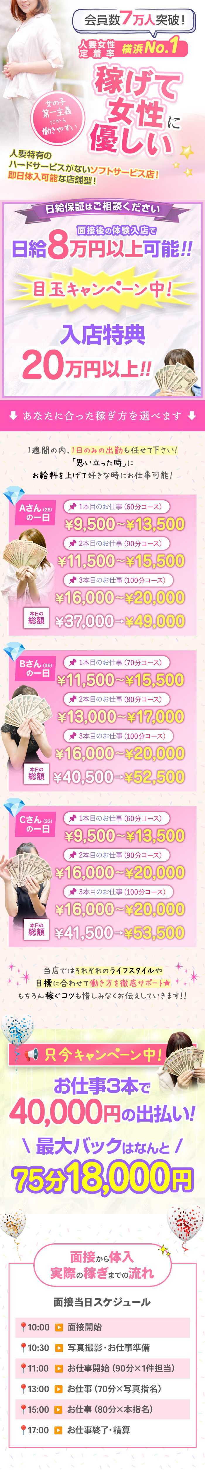 🌸横浜・曙町の老舗店でしっかり稼ぐ!🌸会員数7万人超え!連日、多くのお客様で賑わう大繁盛店です!「本当に稼げるの?」そんな不安をお持ちの方へ、新人女性のリアルなお給料を大公開します!💎新人女性の実際の収入例💎📌例1:昼職と掛け持ちの23歳(早番10:00~19:00)✅10:00~11:20(70分・本指名)¥11,500✅11:40~13:40(90分・指名)¥13,500✅14:00~15:30(70分・本指名)¥11,500✅15:50~17:00(60分・本指名)¥9,500✅17:30~19:00(80分・指名)¥11,000🟢1日合計:¥57,000(月8日出勤→¥440,000)📌例2:新潟から出稼ぎの34歳(10:00~23:00)✅10:00~12:00(100分・本指名)¥16,000✅12:30~14:00(50分・指名)¥7,000✅14:30~16:20(60分・指名)¥8,500✅16:40~18:30(90分・指名)¥13,500✅19:00~20:20(70分・指名)¥10,500✅20:50~22:30(100分・指名)¥14,000🟢1日合計:¥69,500(5日間連続出勤→¥350,000)💰安心して高収入を目指せる環境💰✅シーズン関係なし!安定した集客率で稼げる!✅無理なノルマ・強制出勤一切なし!✅個々のライフスタイルに合わせて働ける!👩🦰私たちは「絶対に嘘をつきません!」👩🦰「本当に稼げるの?」「初めてだけど大丈夫?」そんな不安があれば、まずはお問い合わせください!スタッフが心のケアからお仕事のサポートまで全力でバックアップいたします。📞TEL:0120-828-295📧MAIL:yoko_sakura7@yahoo.co.jp【LINE ID】sakura-hashi【LINE URL】https://line.me/ti/p/VOs0wyicMFまずはお気軽にお問い合わせください!💖✨「1歩踏み出せば、新しい未来が広がる!」✨あなたの「やってみたい」気持ちを全力で応援します!
