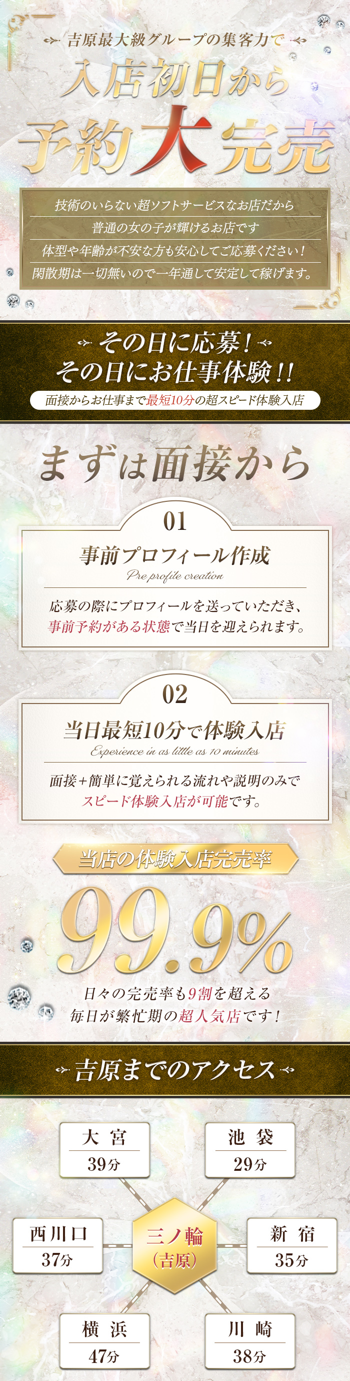 吉原最大級のエンジェルグループ最新店舗!最高レベル店誕生です!! 全面改装でグループNO1の綺麗で豪華なお店です!! とにかくお客様が多いです! 波がなく確実に稼げます♪なので結局は毎月高いお給料になっちゃいます! 清潔感あふれる新しく綺麗なお店で貴女のご応募お持ちしております! 経験のない女の子でも安心して働いていただけるシステムも整っているので 初日からスムーズに不安なく働けます お仕事の内容は非常にソフトサービスで不潔なサービスは一切ありません!! 安心して【シェリーエンジェル】を選んでいただけるように まずはお気軽にお問合せください!