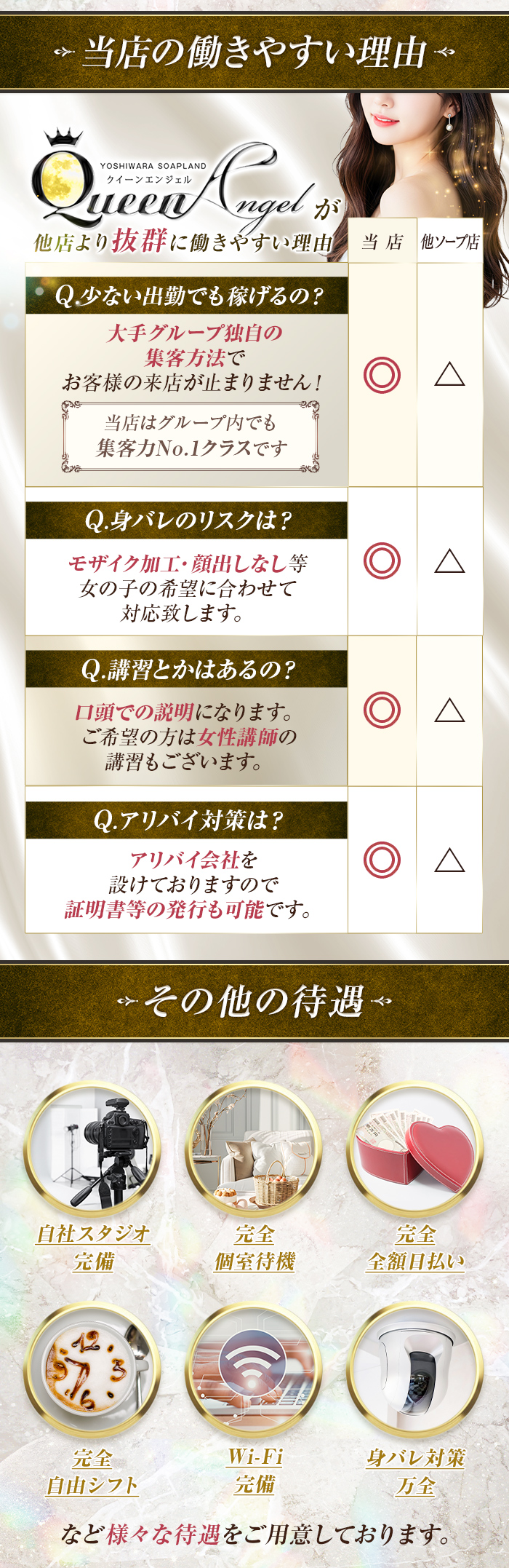Live your life~貴方の人生を応援します~こんにちは。「興味はあるけど不安がいっぱい…」「知らないことばかりで勇気が出ない…」そんな風に悩んでいるあなたへクィーンエンジェルでは未経験からスタートした女の子がたくさん活躍しています!そして“話しやすいスタッフ”がいることも女の子に選ばれている理由のひとつです。初めての面接も初めての出勤もわからないことや不安があって当然です。でもどんな小さなことでもスタッフがあなたの気持ちに寄り添ってサポートします「ちょっと聞きたいだけ」でも大歓迎!あなたのペースで一歩ずつ進める環境を整えています「相談しやすい」「話しやすい」これがクィーンエンジェルのスタッフに共通する特徴です!あなたが「ここにして良かった」と思える場所を私たちは本気で目指しています。どんな些細なことでもどうぞお気軽にご相談くださいね!【待遇】●完全日払い制度●高バック●衛生対策あり●お好きな時間に働けます●掛け持ちOKです●未経験の方大歓迎です●遠方からの応募歓迎です●完全個室待機です●身バレ対策ばっちりです!