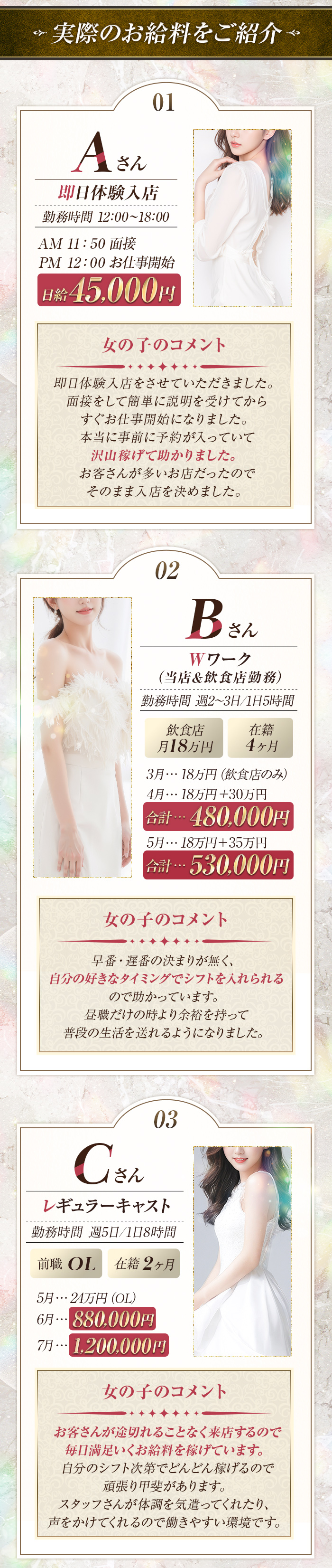 5万円以上目標 1日3万円~4万円以上 入店日 2025/07/03 勤務時間 一日8時間 初日の給与 8時間勤務で