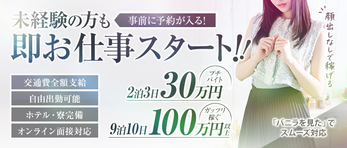 ◆当店で働くキャストの満足度が高い理由◆ 1.バック90分22,000円以上!90分20万円バックのキャストも在籍 2.思い立った1時間後に面接&体験入店可能 3.掛け持ちOK!スキマ時間の受付も可能 4.余裕のあるお客様が多く、ストレスが少ない 5.自宅待機可能なので待機時間のストレスゼロ! 6.未経験大歓迎!特別な肩書きがなくてもOK スキマ時間に自分のペースで効率よく稼ぐことができます! ●以下の方は当店で活躍できるチャンス!! 1.21時~深夜帯でお仕事できる方 2.写メ日記をこまめに書ける方 当店がいっそう成長するためにあなたが必要です!
