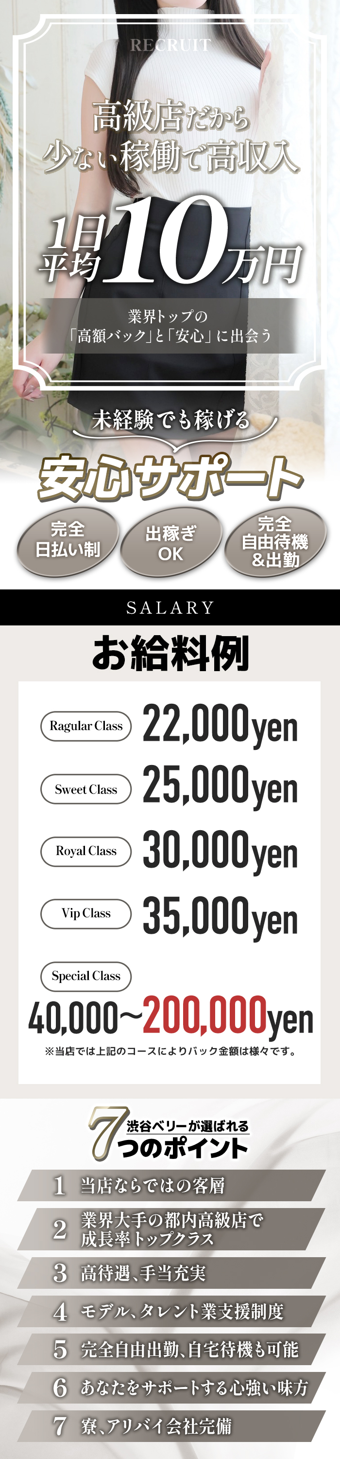 待機場所は?用意するものはあるの?今日は、よくいただくこの質問にお答えします😊渋谷ベリーの待機は、完全個室待機となっています🌿人目を気にすることなく、準備も休憩も自分のペースでしていただけます✨個室なので、メイク直しや身だしなみのチェックも気兼ねなく◎Wi-Fiももちろん完備しています📶スマホを見たり、動画を見たり、待ち時間もゆったり過ごせます😊さらに、ウォーターサーバーもご用意しています🚰お仕事の合間の水分補給も安心です✨シャワーやトイレも完備しておりますので、清潔な環境で快適にお過ごしいただけます🛁お仕事に必要な道具についても、基本的なものはお店でご用意していますのでご安心ください👗お店用の衣装もありますし、「これを使いたい」「この衣装が落ち着く」など、こだわりの私物や衣装の持ち込みもOKです🎀また、面接の際に「実際の待機場所を見てみたい」というご要望も大歓迎です😊事前に見て、不安を解消してから決めていただいて大丈夫です🌸少しでも気になることがあれば、どうぞお気軽にご応募・お問い合わせください🍓あなたからのご連絡、お待ちしております✨