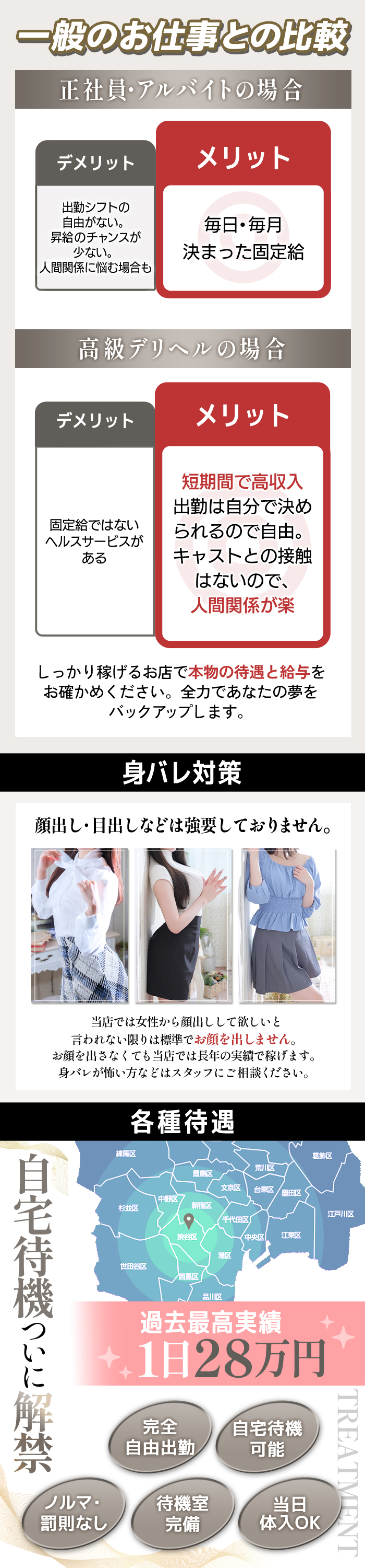 当店は「高級デリヘル」ですので、もっと高額な給料を稼ぐ事が可能です。 実際のお給料は例えば一番基本的な90分のコースで レギュラークラス 20,000円 スイートクラス 25,000円 ロイヤルクラス 30,000円 ヴィップクラス 40,000円 スペシャル 50,000円~20,0000円以上、応相談となっております。 一例として今までには1日で17万円稼いだ女子大生モデルのUさん、 2日間で32万円稼いだOLのFさん、 一か月200万円稼いだ駆け出しアイドルのAさん、等実績があります。