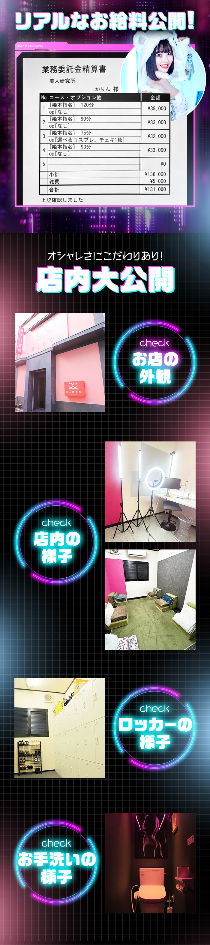【美人研究所】インタビュー企画〜part.1〜在籍キャストさんのリアルな声!!今回は入店約1ヶ月の新人Kさんにお話を聞いてみました!Qまずは入店の理由を教えてください!もともとコンカフェで働いてたんですがもっと収入を増やしたいと思ってこのお仕事始めようとお店探してた時にたまたま目に入ったのが美人研究所でした!1番稼げそうだったのとお店の中が新しくてきれいそうだったのがいいなって思いました!AQ面接の雰囲気はどうでしたか?やっぱりこの業界は怖い人が出てくるのかと思いましたが全然そんなことなかったです笑あいさつも元気で明るいスタッフさん達です!お店のシステムからどうしたら稼げるのかまで丁寧に説明してくれました!AQぶっちゃけ稼ぎはどんな感じですか?正直こんなに稼げるとは思ってなかったです笑出勤は10時間のシフトにしてるんですが、「毎回8万円以上」稼げてます!!AQ実際このお店で働いてみての感想は?確かに接客は疲れることもあるんですけどお客さんもいい人ばっかりなので続けられそうです!なによりもスタッフさんがしっかり稼げるようにサポートしてくれるので私も頑張れてます!頑張っていっぱい稼ぎたい人にはぴったりのお店です!!AQ最後に一言お願いします!未経験で不安でしたがこのお店に来て良かったです!もし迷ってるなら一度「体験入店」してみるのがいいと思います!正直経験がないと大変なこともあるけれど、ちゃんとサポートしてくれるスタッフさんがいるのが心強くて安心して働けると思います!A美人研究所当店は「未経験」「経験が浅い」そんな方も大歓迎!!実際たくさんの未経験だった方が今も在籍しています!はじめてで不安なことがいっぱいあってもひとつひとつ出来るようになるまで丁寧にサポートしています。なにより経験がなくてもしっかり稼げるお店という実績があります!まずはご質問やご相談からでも構いません。お気軽にお電話やSNSでお問い合わせください!さらに今なら面接に来ていただいた方全員に「交通費5,000円」お渡ししています!ぜひ少しでも気になった方はお話だけでも聞きにきてください!