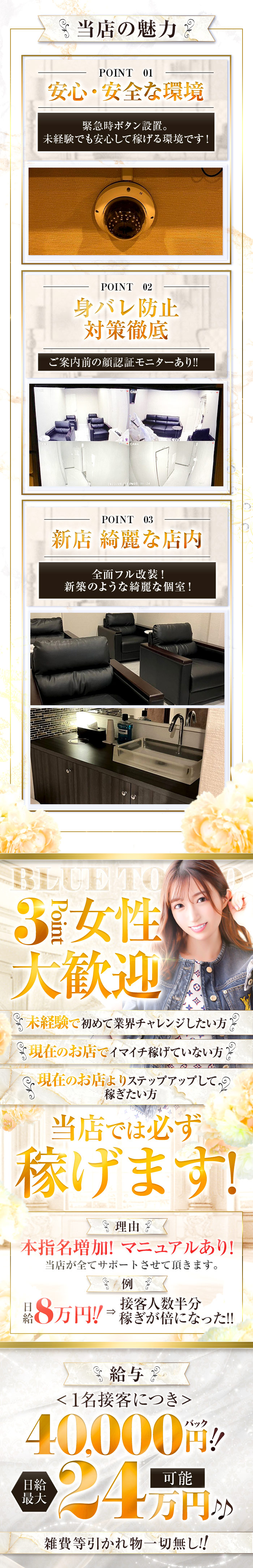 当店では未経験でも勤務可能でございます! 高級店ですと、勤務経験やお客様を持っていないと採用されにくい傾向があるかと思いますが、当店では関係ありません! また集団待機もなく完全個室待機のため他のベテランのお姉さまとのからみなどもなく派閥や女性間のトラブルはございません! お客様の顔確認モニターもあり初めてでも安心して働けるようになっております!