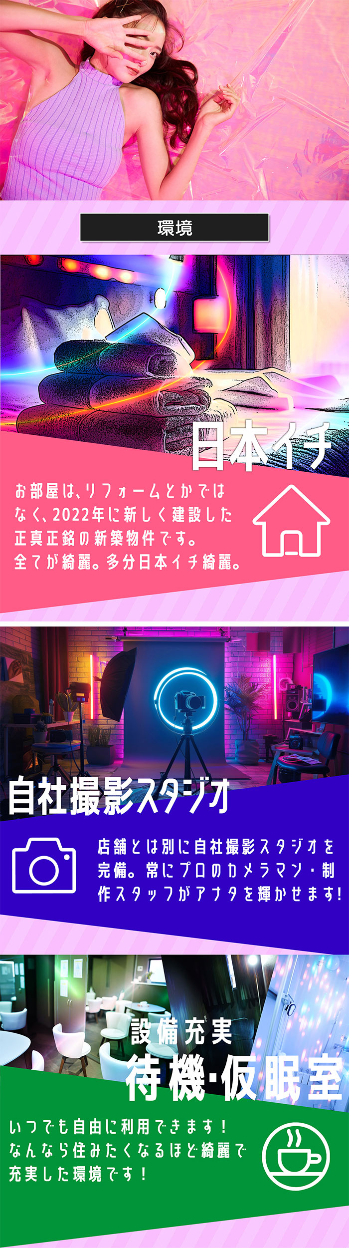 大手グループが経営しているお店だよ。待遇や条件も手厚くて安心だし、集客力もあって女の子が稼ぎやすい!待遇や条件はグループの中でも店舗ごとに変わってくるから、気になるポイントは問い合わせて聞いてみよう♪