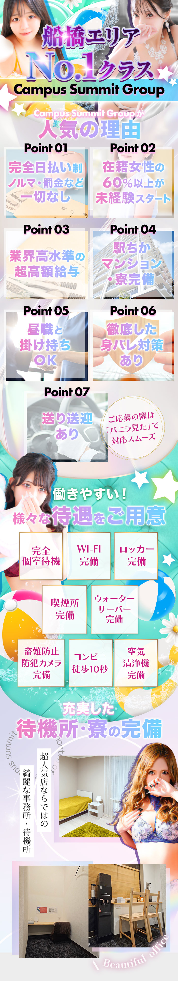 創業20年の実績!認知度抜群でリピーター&新規のお客様が多数船橋エリアと錦糸町エリアで、合わせて5店舗を運営する同グループ。「若い方向けのお店と人妻店、どちらもあるため、幅広い年代の女性が活躍できます」と篠原さんが話してくれました。また、太一さんによると稼ぎやすさも魅力。創業から20年のため、認知度が抜群。お客様は新規、リピーターともに数が多いのだそうです。