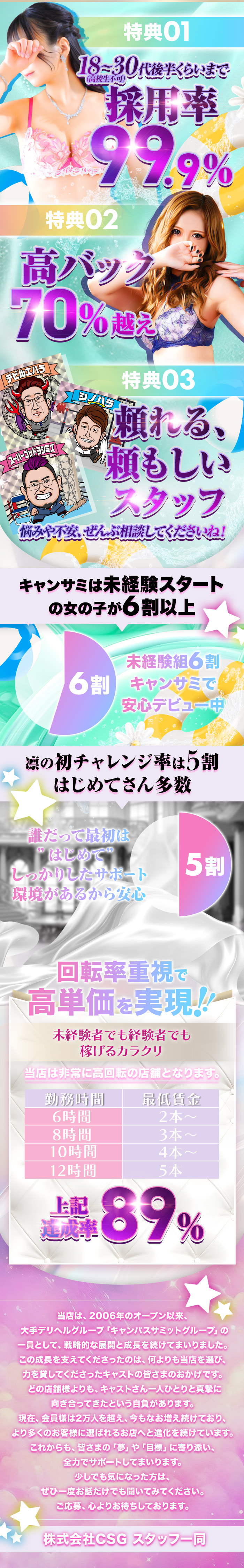 大手グループが経営しているお店だよ。待遇や条件も手厚くて安心だし、集客力もあって女の子が稼ぎやすい!待遇や条件はグループの中でも店舗ごとに変わってくるから、気になるポイントは問い合わせて聞いてみよう♪