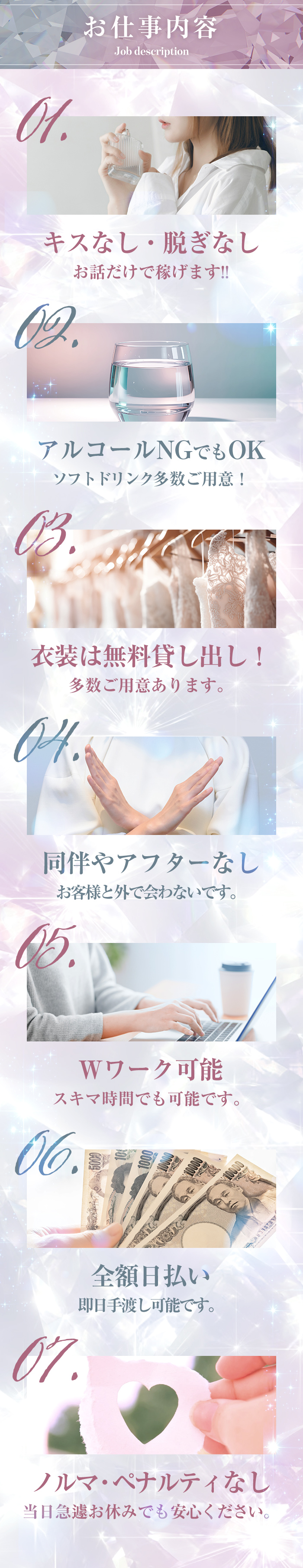 女の子のお仕事に対してノルマや罰金などがないお店だよ♪お店によっては、入店から◯ヶ月以降からはノルマが発生したり、無断欠勤などでは罰金になってしまうなどルールがあったりもするから、入店前にはしっかり聞いてみてね!