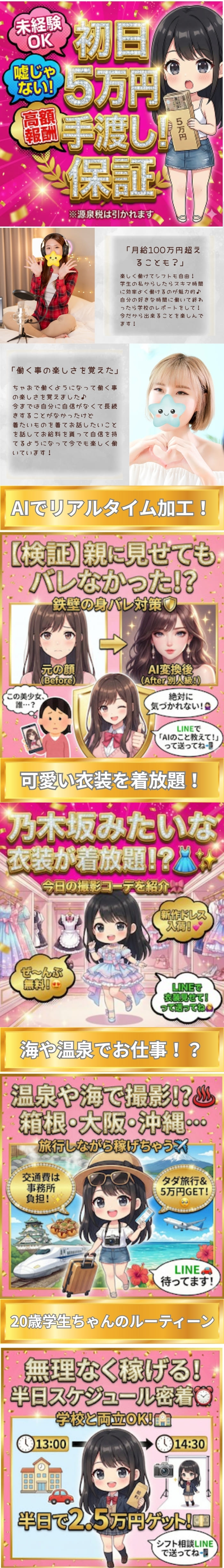 こんにちは!ちゃおスタッフです📝今日は、先月デビューしたばかりの大学生[Rちゃん]にインタビューしました!ぶっちゃけ、応募する時どう思ってた? って聞いてみたよ😳スタッフ:「応募したきっかけは?」[Rちゃん]:「インスタで見て、給料良すぎて最初は詐欺かと思いました(笑)」スタッフ:「だよね〜!(笑)実際どうだった?」[Rちゃん]:「面接に行ったら女性スタッフさんが対応してくれて、説明も丁寧だったから安心しました。 本当にその日に5万円もらえて、疑ってごめんなさいって思いました😂」[Rちゃん]みたいに、最初は「怖い」「怪しい」って思ってる子がほとんどです。だからこそ、私たちは「正直に」「嘘をつかない」ことを徹底してます✨無理な勧誘は絶対にしないので、[Rちゃん]みたいに確かめに来てほしいな!「私もRちゃんみたいに話だけ聞いてみたい!」そう思ったら、まずはLINE登録してね📲質問箱だと思って、なんでも送ってね〜!
