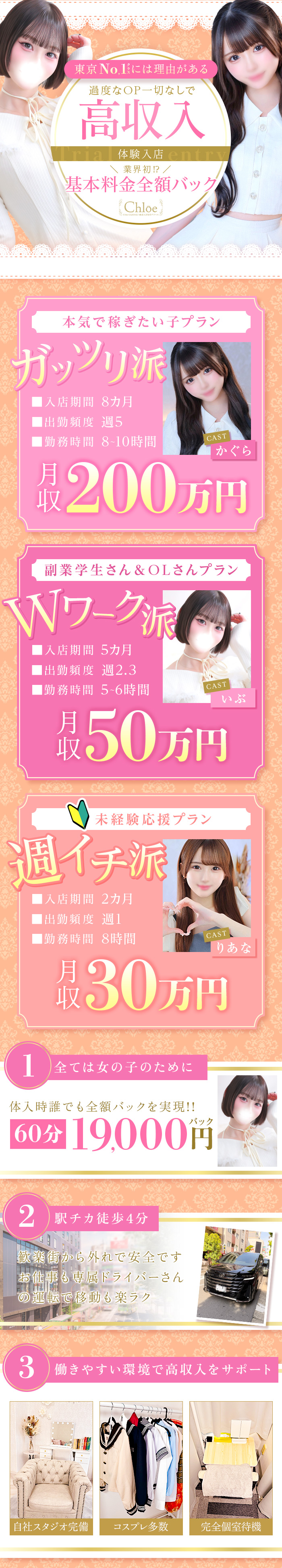 🍊Chloe錦糸町店🍊 皆様おはこんばんにちは!! Chloe錦糸町店の【藤田】です♪ ありがたい事に毎日多くの女性に面接来て頂いております💕 それでは本日の店長ブログのテーマはこちら 「撮影スペースのご紹介!!」 今日は女の子に大人気の【撮影スペース】をご紹介しちゃいます🎀 Chloeでは、まるでモデルルームのような オシャレで清潔な撮影スタジオを事務所内に完備📸 ・新作&人気のコスプレ衣装も多数用意🎀 ・写メ日記もスタッフがしっかりサポート✍️ 「写メ撮るの苦手なんです…」 「どういう文章書いたらいいか分からない…」 そんな女の子も心配ご無用! スタッフがアドバイスや構図提案もしますし、 「一緒に撮影しながら覚えましょ~!」ってノリで進めていきます😊 ここまで見て頂きありがとうございます🙇♂️ 是非お気軽にご応募お待ちしています! お給料面だけではなくその他のサポートが充実! 💎時給は最大18,000円! 💎体験入店保証制度あり 💎店泊・マンションでの寝泊まり可能(無料) 💎高額前借り制度あり 💎面接交通費支給制度あり 💎業種問わず掛け持ち可能 💎待機室完全分煙 💎個室待機 💎自宅待機可能 などなど・・・ お客様の年代は30代~50代で 社会的に成功されているお客様ばかりです! 当然遊び方もスマート♪ ⭐週に1日短時間しか出勤できない ⭐顔出しが出来ない ⭐錦糸町などエリアを限定にしたい ⭐自宅のデリバリーNGにしたい などなど、女の子によって諸事情があると思います! もちろんOKです! あなたに合った働き方も提案していきます♪ 見た目に自信がない… 初めてで不安… 今までのお店で稼げなかった… 入店する際に不安は多々あるかと思います! 最初は稼げるは当たり前です 大切なの事は、しっかり稼ぎが安定・継続できる事だと思います。 Chloe錦糸町店ではそんなすべての悩みを解決で来ちゃいます! ご質問だけでも構いません♪ お問い合わせから面接・体験入店まで迅速丁寧な対応に自信あり! お気軽にお問い合わせくださいませ♪