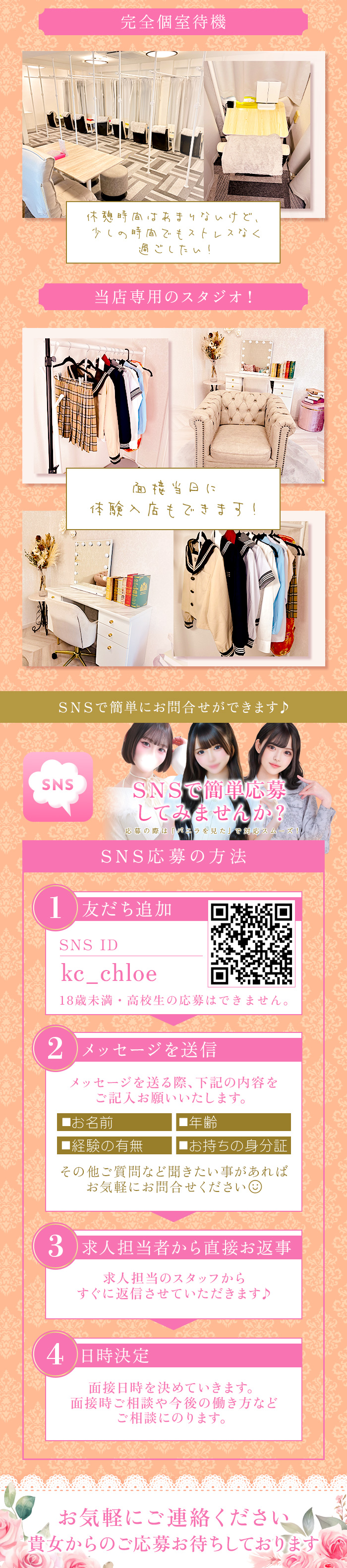 当店では常に女の子からの求人応募・面接希望に対応できる様、求人用ライン・求人用ダイヤル・メールでのお問い合わせには即レスにて返信対応しております。