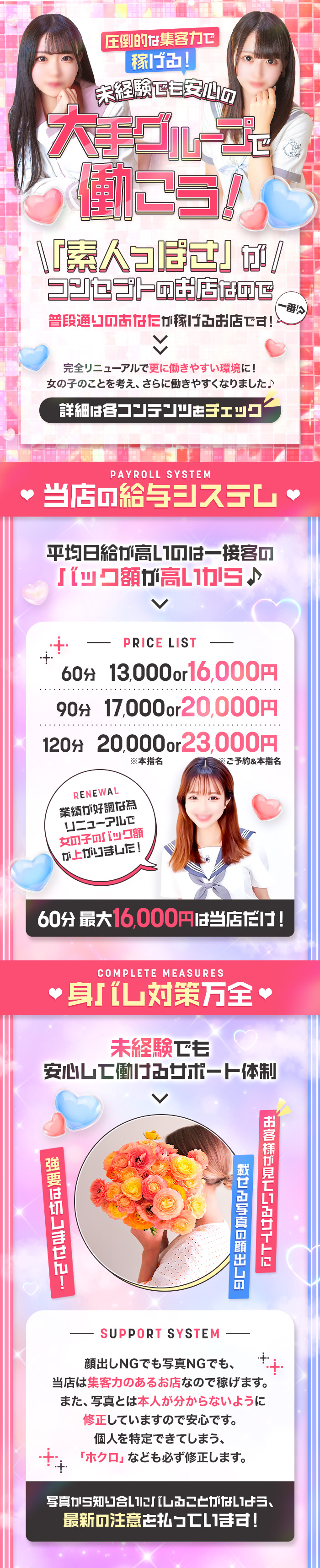 未経験の女の子でも安心して働ける環境を整えてます♪まず、お客さんが優しい☆これが一番大切じゃないかな?クラスメイトは素人学園という名前の通り業界未経験や素人の女の子が多数在籍しています!スタッフさんはもちろん優しいので仕事に行く前にしっかり流れを教えてくれお客さんへの説明と理解もバッチリ☆働く上で大切な身バレ対策は徹底させてもらってます☆彼氏さんやお母さんにバレないようにお店とのやり取りも最低限でOK!なんでもわからないことはスタッフさんに聞いてください♪親身になって相談に乗りますよ(*´ω`*)