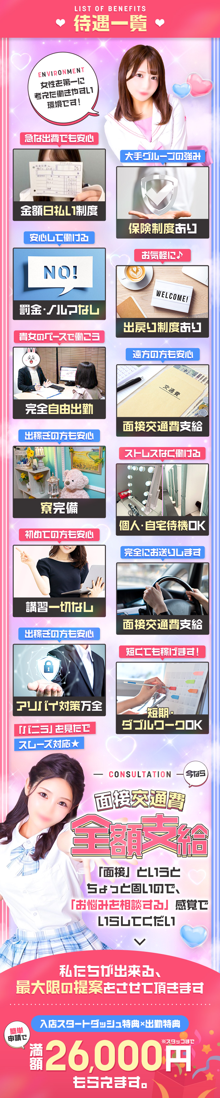 副業やWワークを歓迎しているお店だよ。時間が許す限りガンガン働いていお金を稼ぎたい女の子にはありがたいよね。シフトの入れ方にはお店ごとに決まりがあるから、詳しい条件は問い合わせてみよう♪