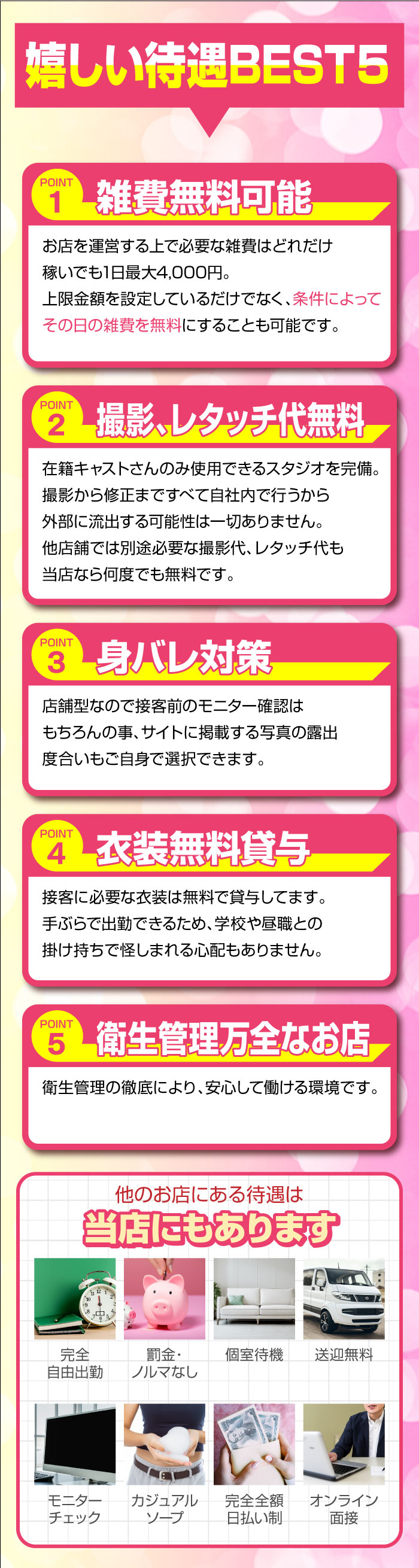 女の子のお仕事に対してノルマや罰金などがないお店だよ♪お店によっては、入店から◯ヶ月以降からはノルマが発生したり、無断欠勤などでは罰金になってしまうなどルールがあったりもするから、入店前にはしっかり聞いてみてね!