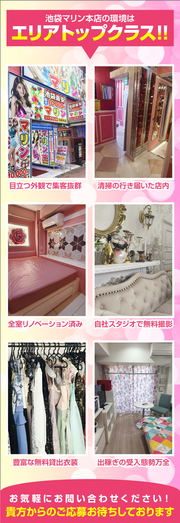 \ソフトサービスなのに日給15万円!?/池袋で「一番」効率よく稼げるお店はここだ!✨「ナイトワークって大変そう…」「稼げるって聞くけど、手取りは少ないんじゃ?」そんな不安、池袋マリン本店が全て解消します!💎💰 驚異の還元率!お給料システム40分:9,000円60分:13,000円80分:17,000円✅ 本指名:+2,000円✅ ネット指名:+1,500円✅ プレミアムキャスト制度:+1,000円〜5,000円✨ 9時間で平均10万円を実現する子が多数!働きやすさエリアTOPクラス!5つの秘策 💖 1 雑費無料が可能! 1日最大4,000円の上限設定!条件次第でその日の雑費が0円に♪ 2 撮影・レタッチ完全無料! 自社スタジオ完備。プロの修正で、最高に可愛い貴方をプロデュース! 3 万全の身バレ対策! モニターチェック徹底。写真の露出度もご自身で選べるから安心です! 4 衣装はすべて無料貸出! 手ぶら出勤OK。学校帰りや会社帰りでも怪しまれる心配なし! 5 清潔なリノベ済みルーム! エリア屈指の綺麗なお店。完全個室待機でリラックスして働けます!「理想の私」への第一歩、応援します。初期費用0円・ノルマなし・駅チカ!難しいことは考えなくて大丈夫です。私たちが全力で稼がせます!※24時間365日受付中!質問だけでも大歓迎♪ ⬇️SNSでお店をチェック⬇️ ⬇️バニラdeデビューをチェック⬇️