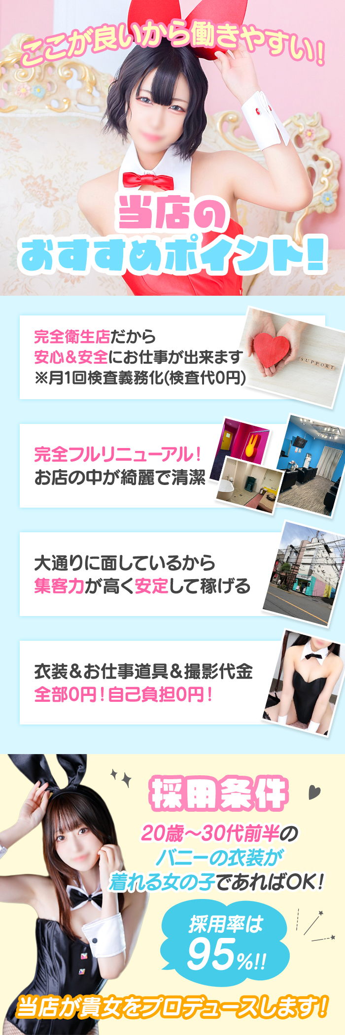お疲れ様です!スタッフのフォルランです♪この春上京の皆さんや新しくナイトワークを始めようか悩んでいるあなた!未経験の方でも安心してスタートできます(^^)当店は完全衛生店なので難しいサービスは一切なし!初めての方でも無理なく働ける環境です♪さらにコンセプトはかわいいバニー衣装☆衣装はすべてお店でご用意しているので手ぶら出勤OK!(。・ω・。)ノ準備するものもほとんどなく気軽にお仕事を始められます♪そして…即日体入も可能!!「どんなお店か見てみたい」「自分にできるか試してみたい」そんな方も大歓迎です(≧▽≦)安心して働けてしかもらくらく高収入♪気になる方はぜひお気軽にお問い合わせくださいね☆