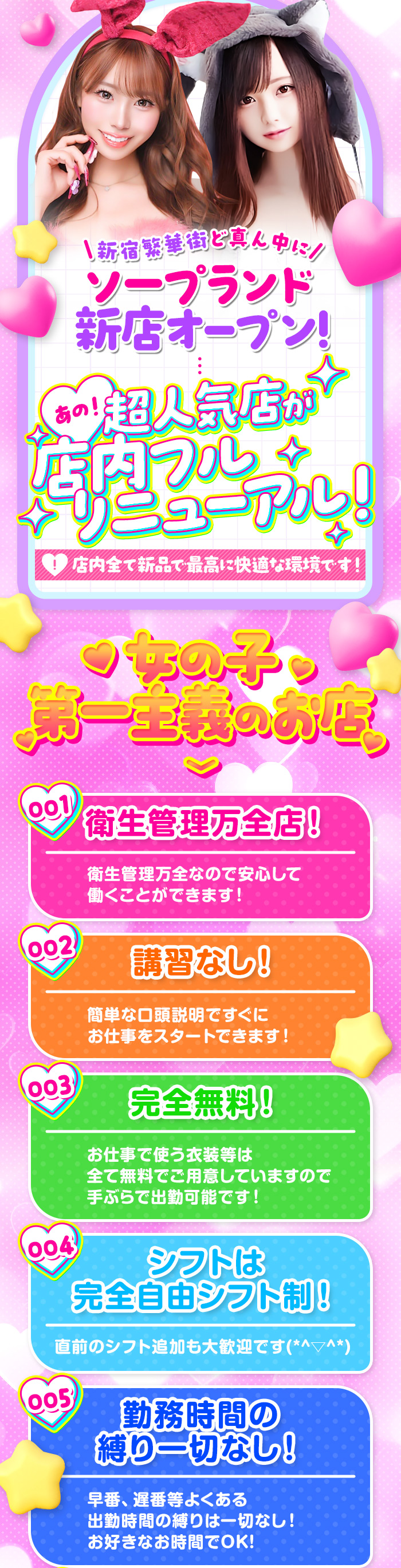 ●●●●●●●●●●●●●●●●●フルリニューアル●●●●●●●●●●●●●●●●●綺麗なお店で!綺麗な環境で!お仕事をしたい!!そんな女の子は是非当店へ!店内フルリフォーム工事で最高に綺麗な環境です!店内備品も全て★新品★衛生面もバッチリです!面接のみや、お話を聞くだけでも大歓迎です♪まずはお気軽にお問い合わせください(*^-^*)◆◇◆◇◆◇◆◇◆◇◆◇◆◇LINEID:osiro127mail:shinjuku@a-crystal.co.jpTEL:03ー3232ー2277◆◇◆◇◆◇◆◇◆◇◆◇◆◇