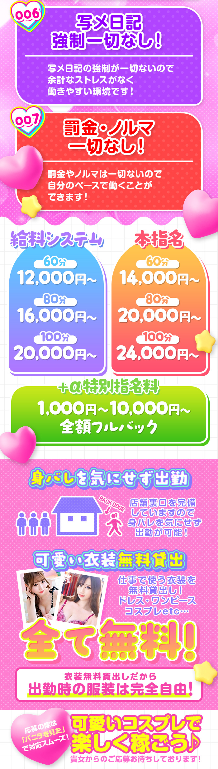 女の子のお仕事に対してノルマや罰金などがないお店だよ♪お店によっては、入店から◯ヶ月以降からはノルマが発生したり、無断欠勤などでは罰金になってしまうなどルールがあったりもするから、入店前にはしっかり聞いてみてね!