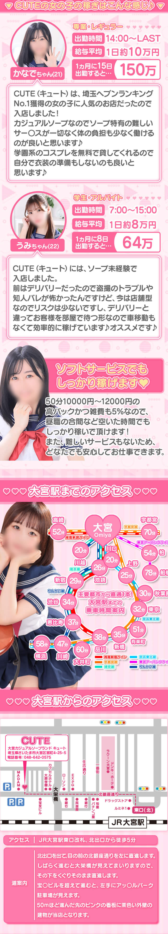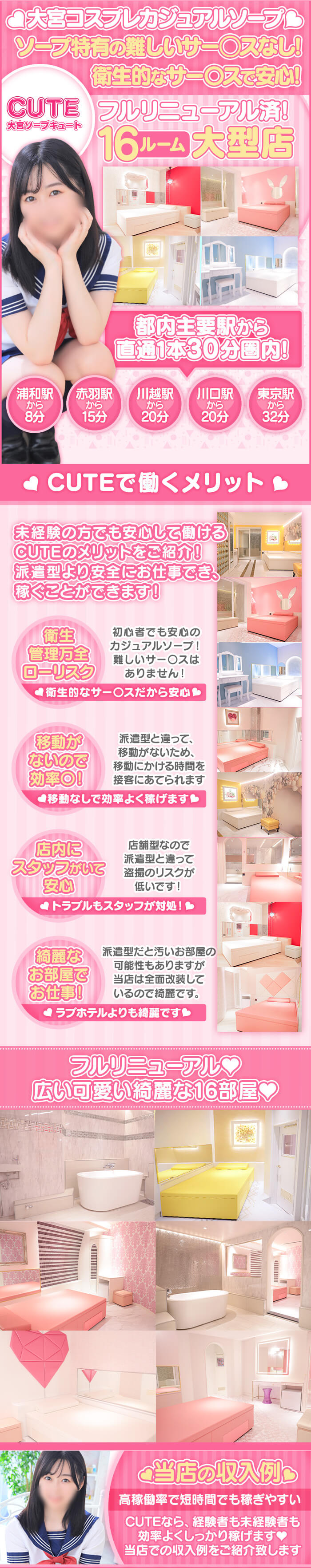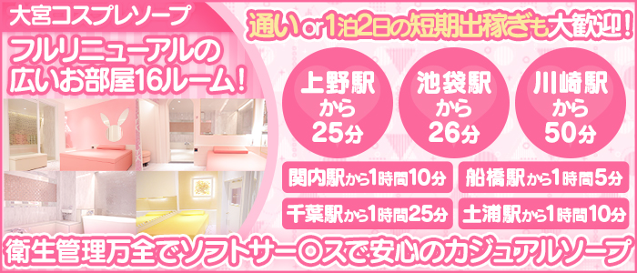 大宮カジュアルコスプレソープCUTE(キュート)♡50分バック(サービス料)1万円~1万2千円♡日給8万以上可能♡接客のお部屋は16ルームで個室待機も可能♡都内まで無料で社用車で送りを行っています♡
