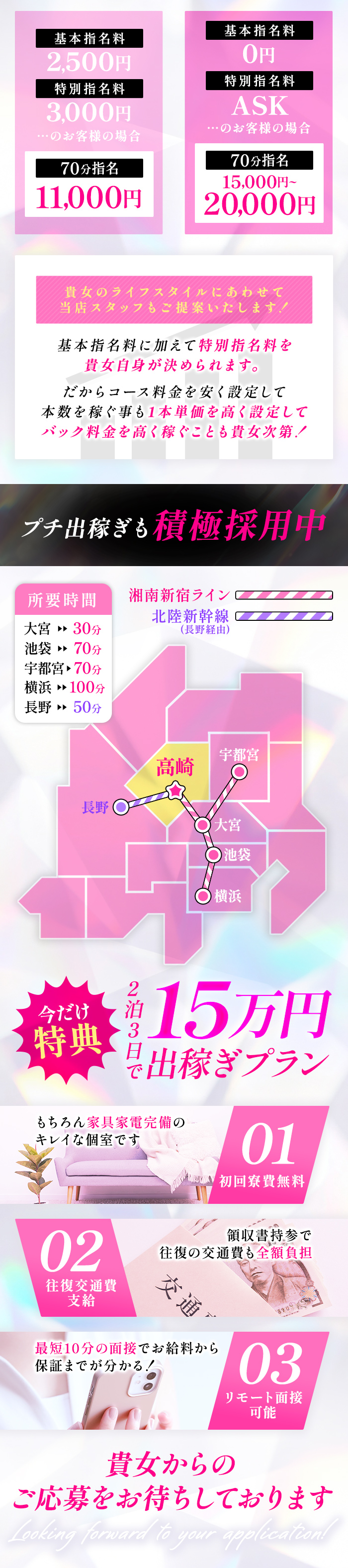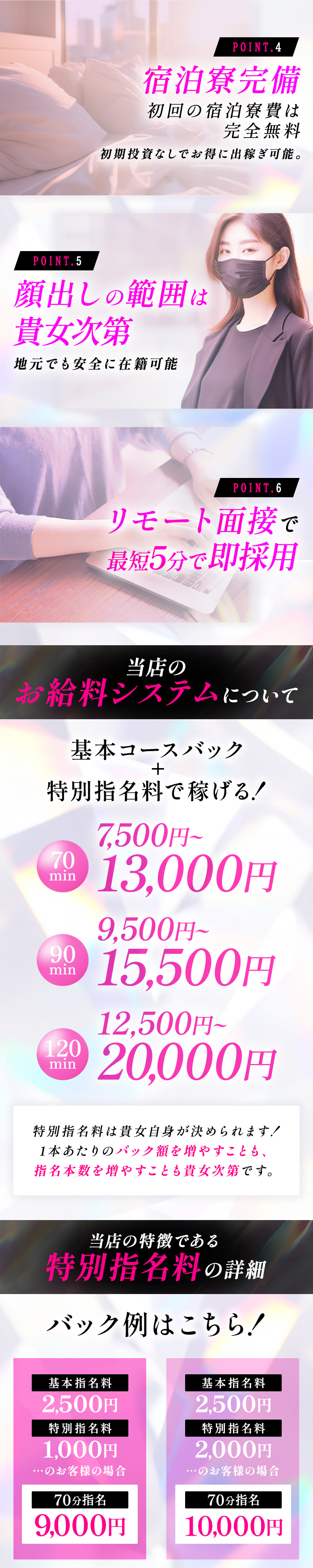 上記は最低金額です。 あなた自信で決めることができる「特別指名料」を追加で支給します。 70分13,000円以上のバックも可能! 1日10万円をお持ち帰りしている方も多数在籍中!