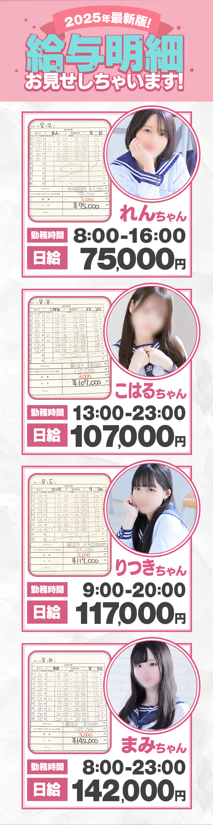 当店では、業界未経験の女の子も多数在籍しております。 お客様にとって、緊張や戸惑いといった、お仕事慣れしていない子を好む方もたくさんいらっしゃいますので、テクニックや会話が出来ないことはなんのマイナスではないのです。 更に、コンセプトがしっかりしていますので、それに従った衣装を着ますので、容姿の差もほとんど謙遜なく稼げます。