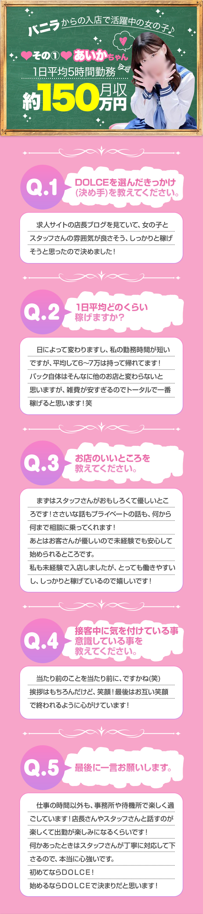 業界大手DOLCEグループが手掛ける人気店で 🔰未経験のあなた🔰 【今月の月収3倍にしてみませんか?】 🔰体験入店3日間で30万円🔰 【宣誓】女の子第一主義!GIRLS FIRSTのお店です! 接客で必要なものは “全 て お 店 負 担” となっております! 【万全の身バレ、アリバイ対策】で安心して働けます! 【1人1人女の子と十分に相談して万全を期しています】 高額バックを受け取れるシステムや、頑張りに応じてボーナスを支給する制度などで 女の子を全力サポートいたします! 【経験未経験問わず大歓迎!】 18歳(高校卒業)~29歳まで! もちろん未経験者のご応募大歓迎です! 大手グループならではの女性講習員のしっかりとした研修がございますのでご安心ください♪ 【体験入店大歓迎】 🔰体験入店3日間で30万円🔰 体験入店では面接時にかかる往復の交通費をなんと “全 額 支 給” いたします! 店内見学・即日体験入店大歓迎! 面接日に最短30分で そのままお仕事可能です♪ 【未経験の女の子でも可能】 ご質問だけでも構いませんので、お気軽にお問い合わせください! 「女 の 子 第 一 主 義」をコンセプトに営業する 当店スタッフ一同全力で女の子をサポートさせていただきます!